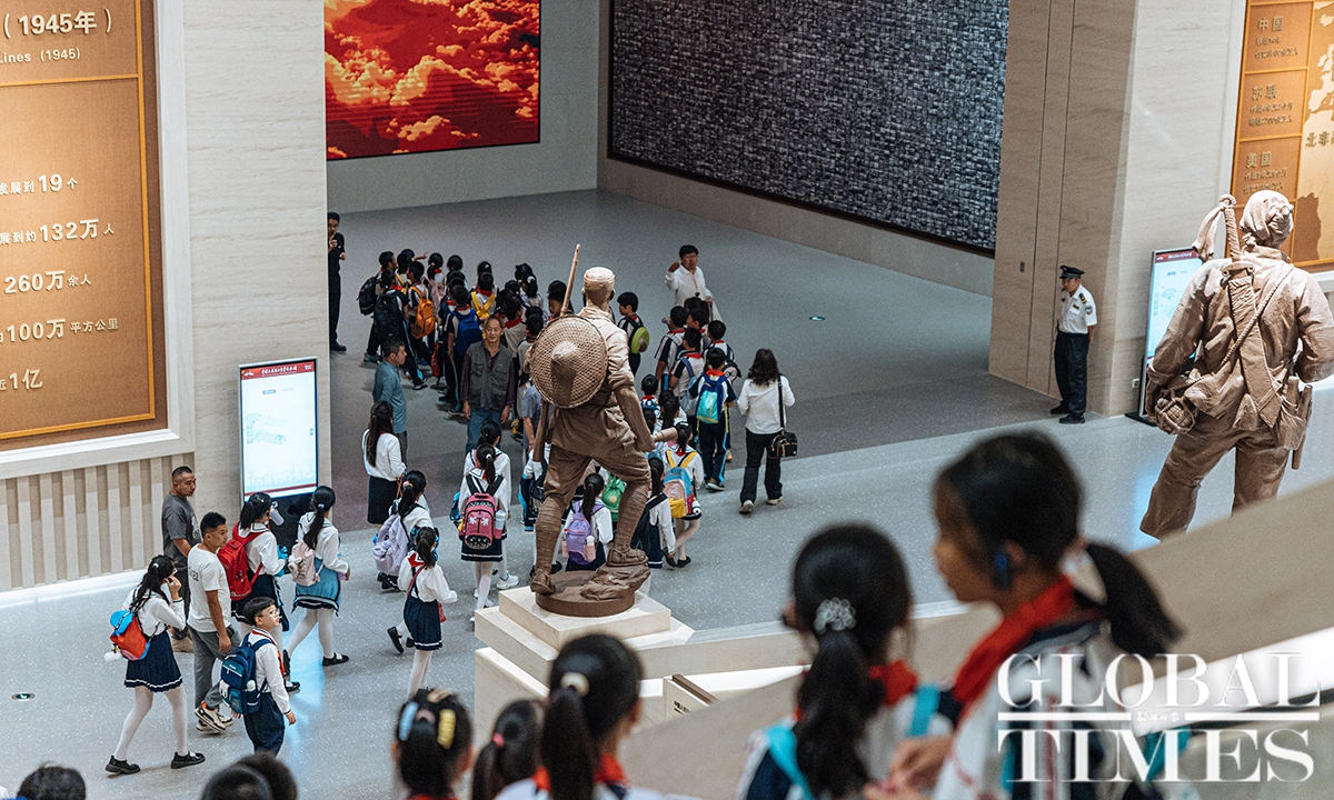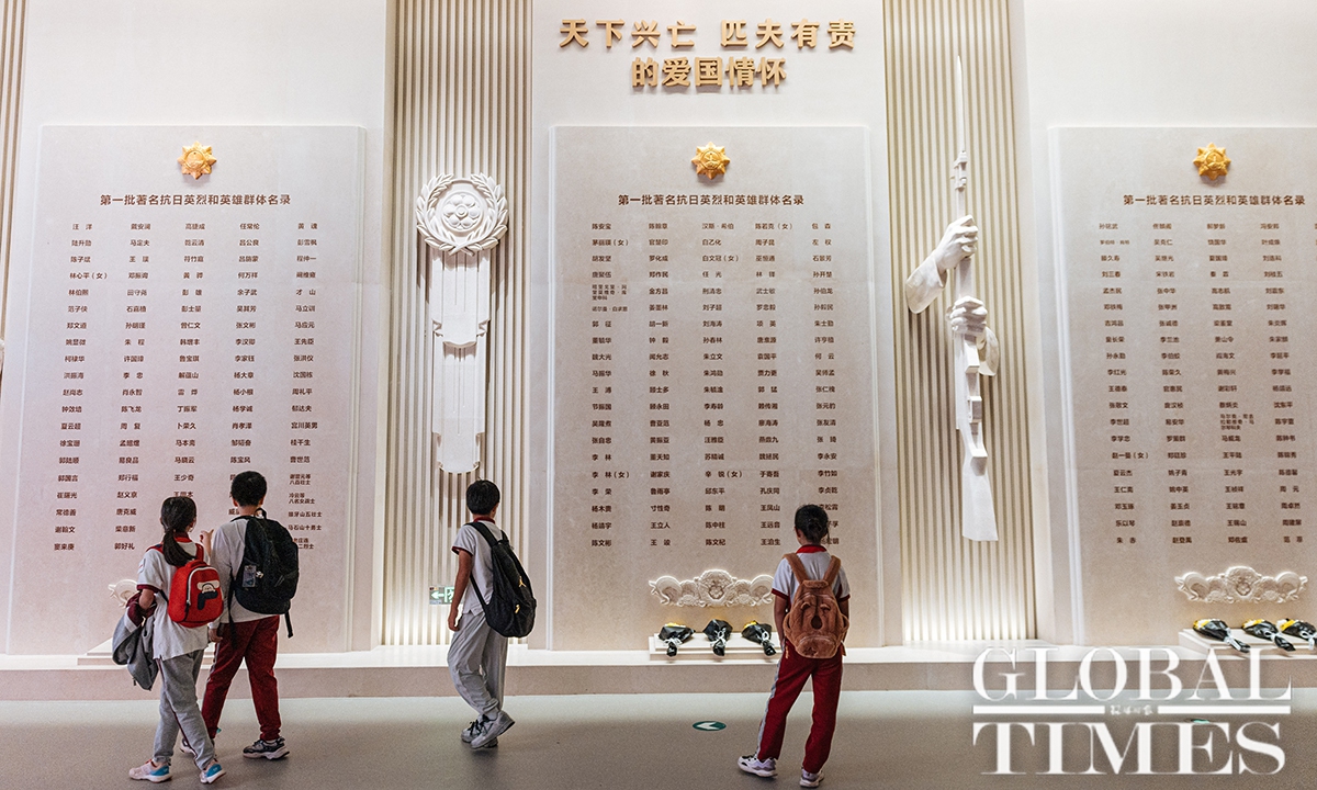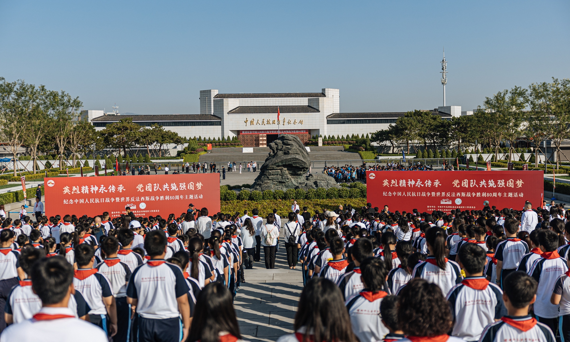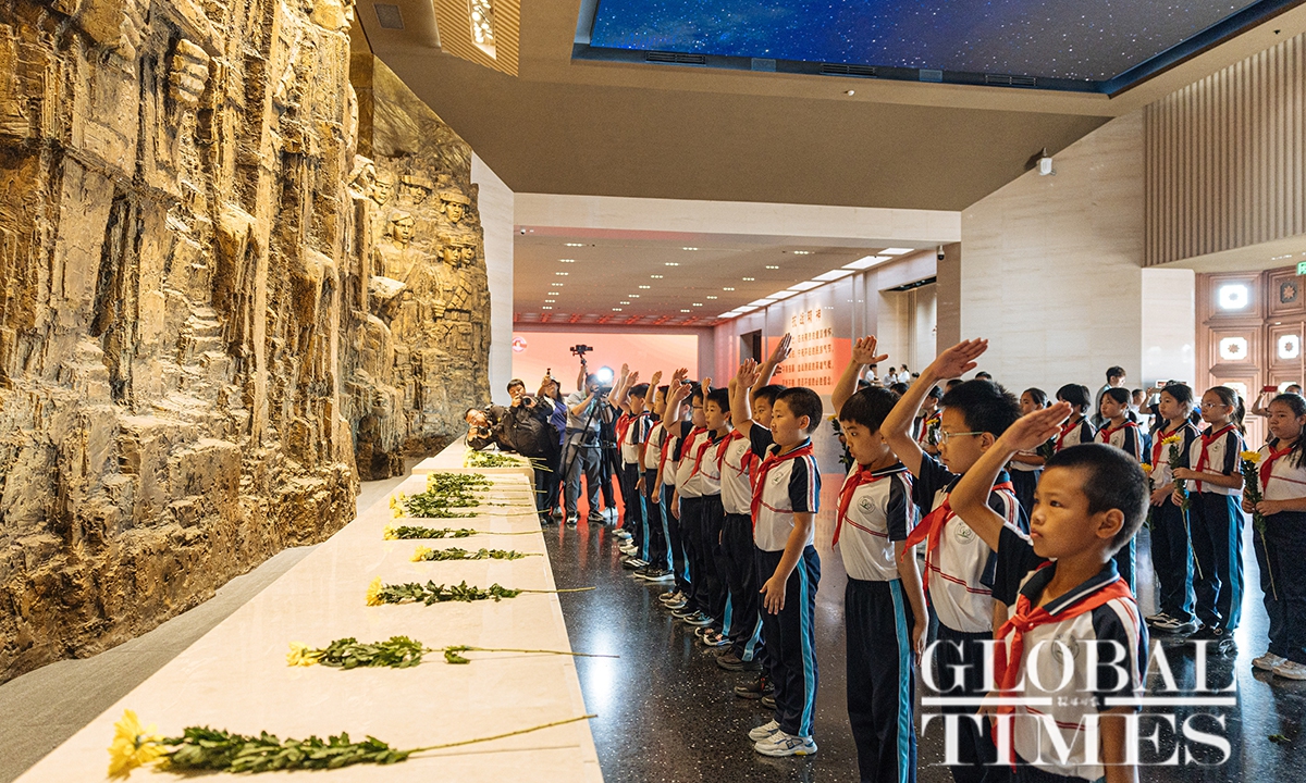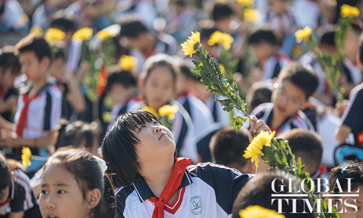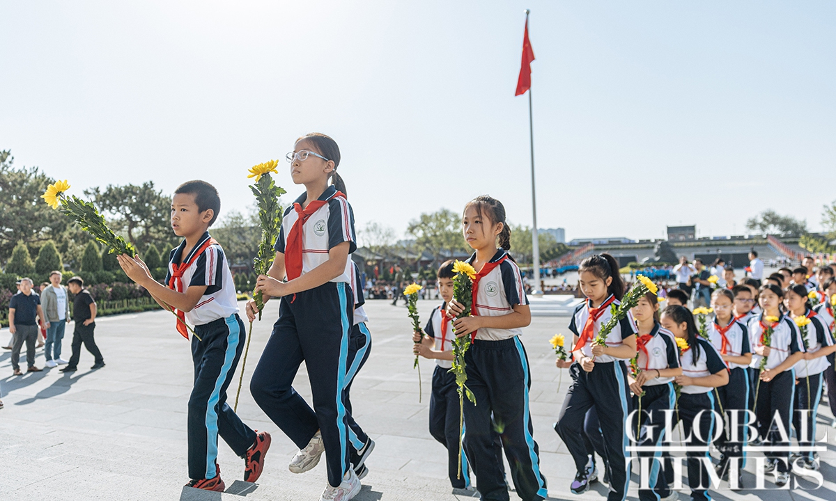 Nearly 1,000 primary school teachers and students gathered solemnly at the Awakening Lion Square of the Museum of the War of the Chinese People's Resistance Against Japanese Aggression on September 30 during China's 12th Martyrs' Day. They participated in thematic educational activities that guided teachers and students to honor revolutionary martyrs, carry forward the red gene, and strengthen their ideals and convictions through immersive ceremonial education and profound ideological lessons. Photos: Li Hao/GT