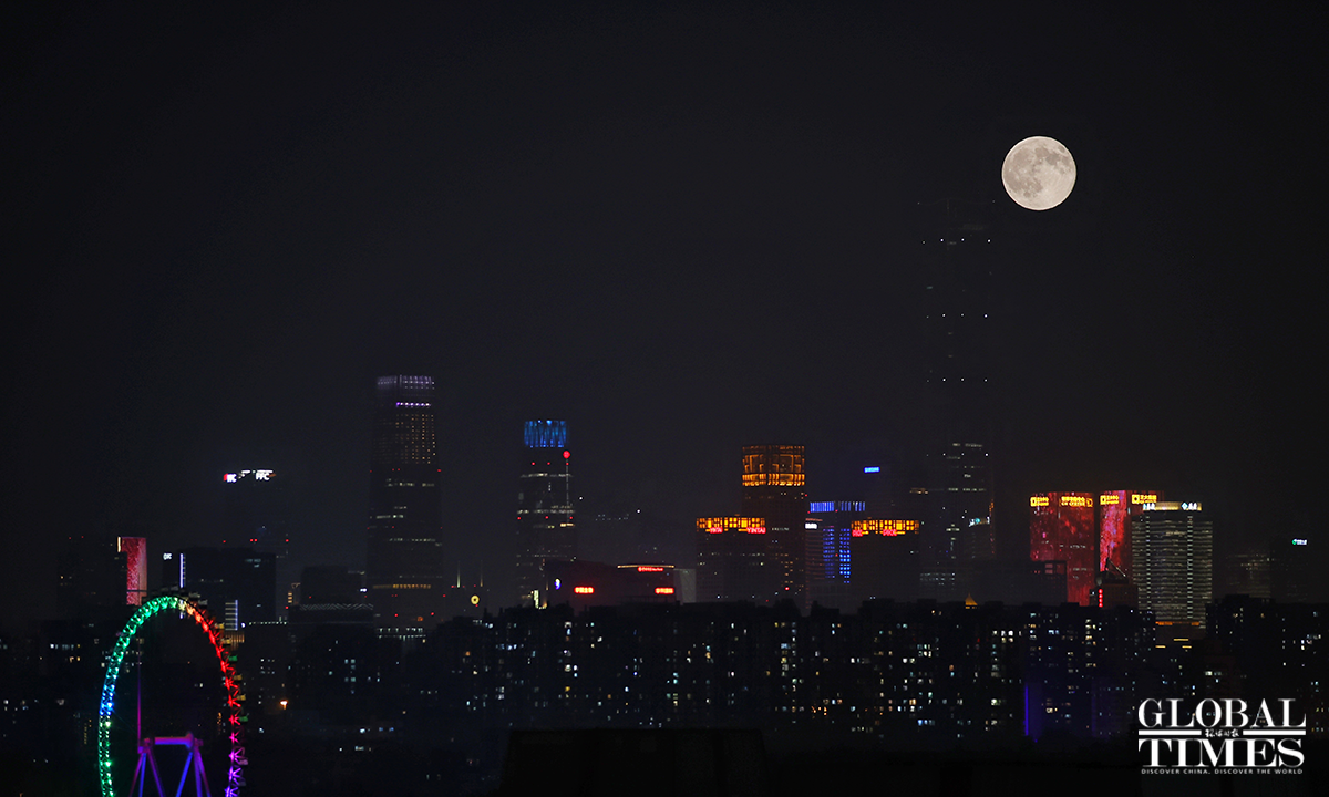 The full moon lights up the sky at the central business district (CBD) of Beijing on October 7, 2025. Photo: Cui Meng/GT figcaption >