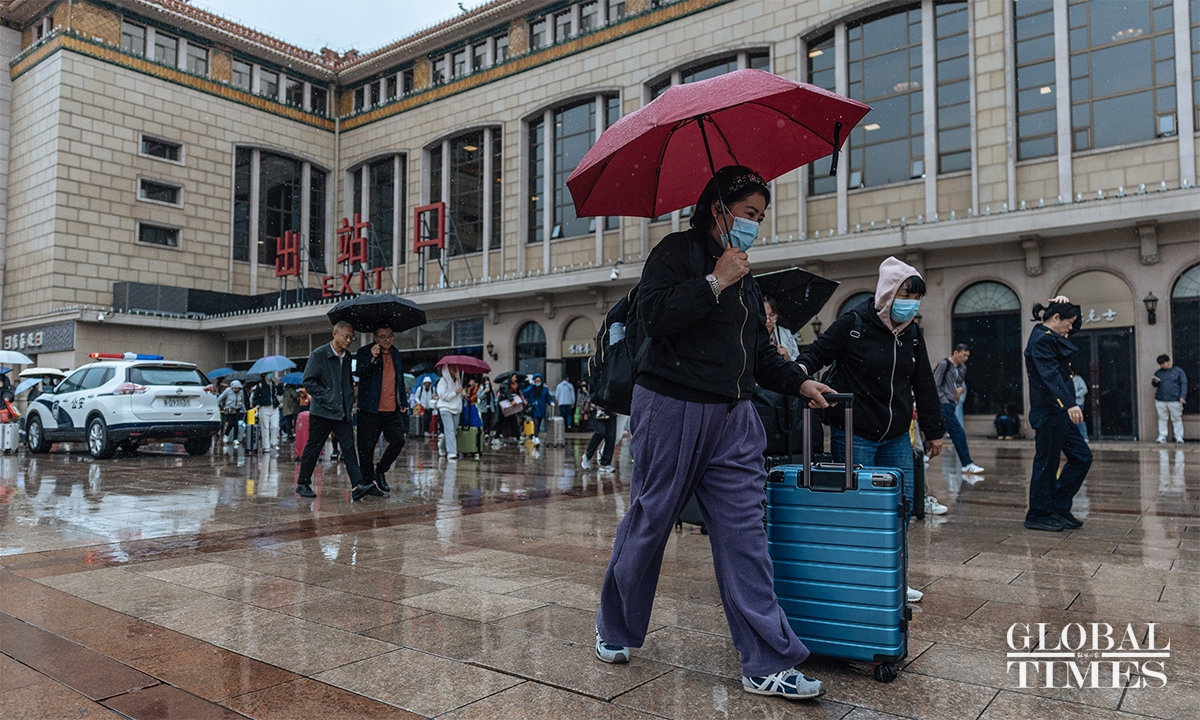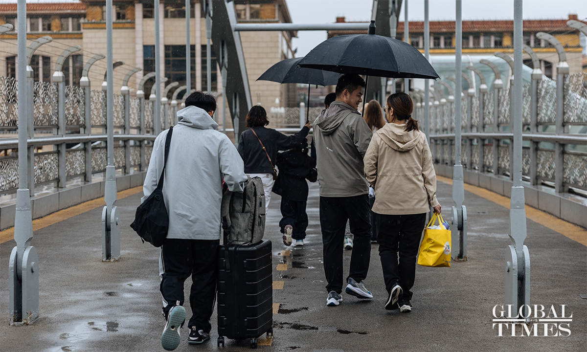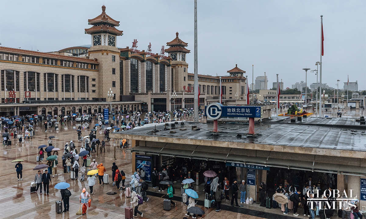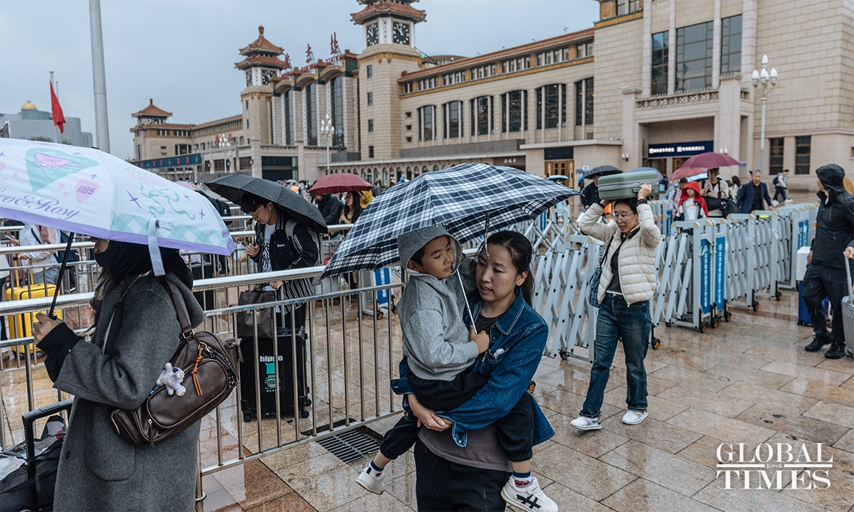October 8 marked the last day of this year's National Day and Mid-Autumn Festival holidays, with major railway stations in Beijing experiencing a peak in return passenger flow. At Beijing West Railway Station and Beijing Railway Station, travelers were seen returning to the capital in the rain. Photos: Li Hao/GT