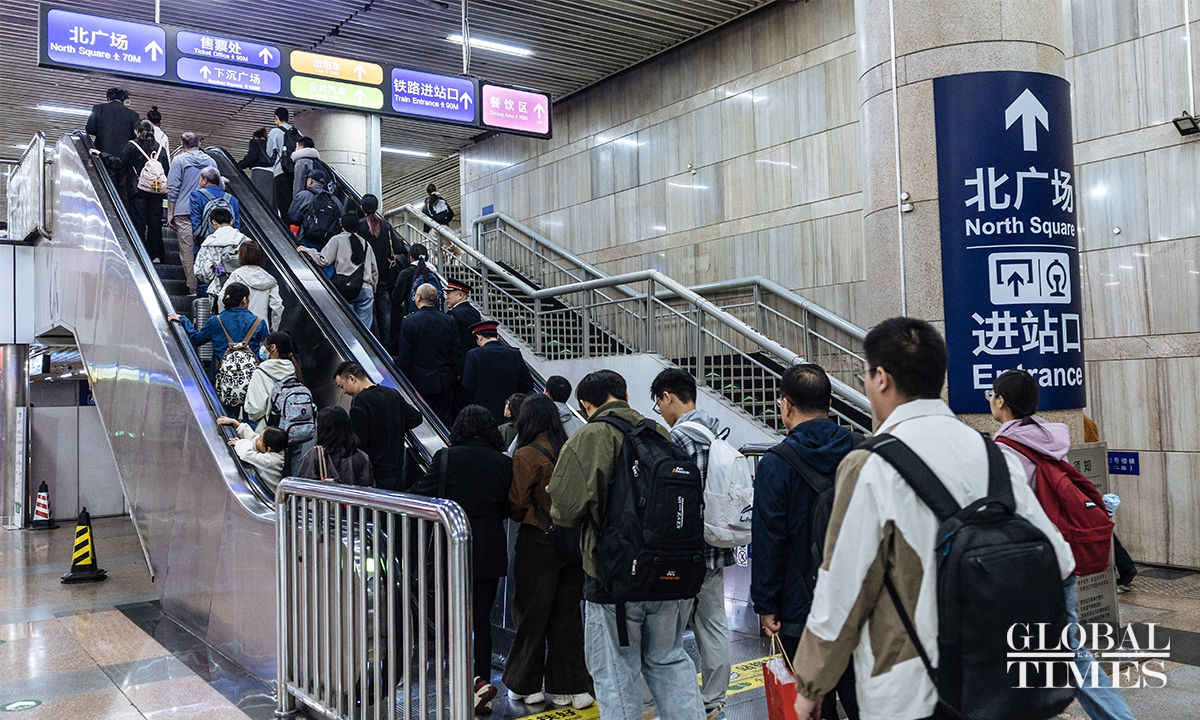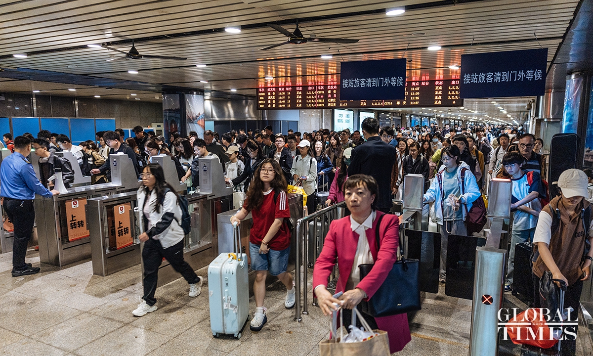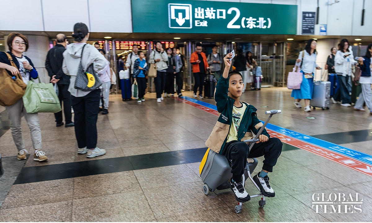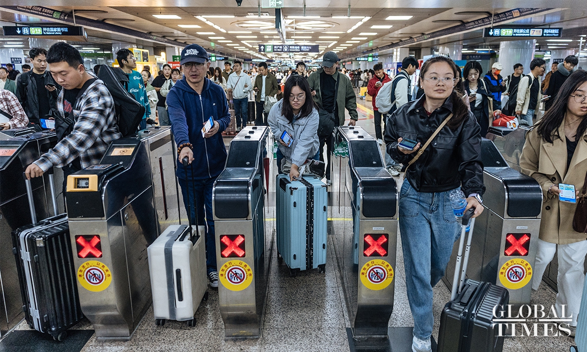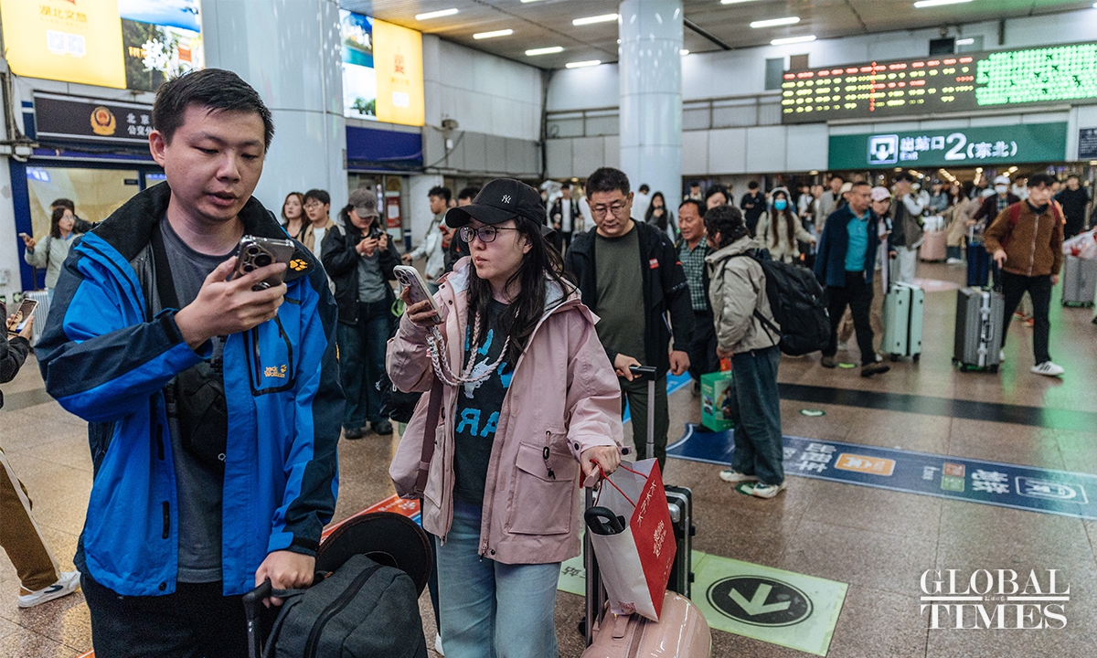 October 8 marked the last day of this year's National Day and Mid-Autumn Festival holidays, with major railway stations in Beijing experiencing a peak in return passenger flow. At Beijing West Railway Station and Beijing Railway Station, travelers were seen returning to the capital in the rain. Photos: Li Hao/GT