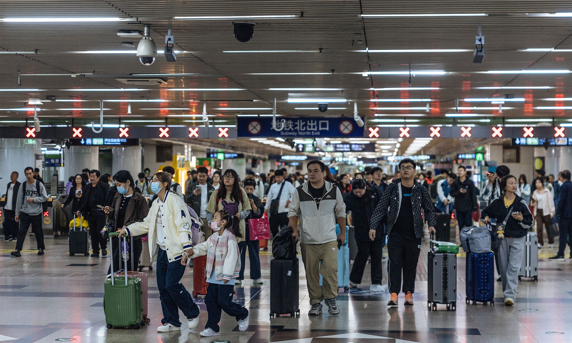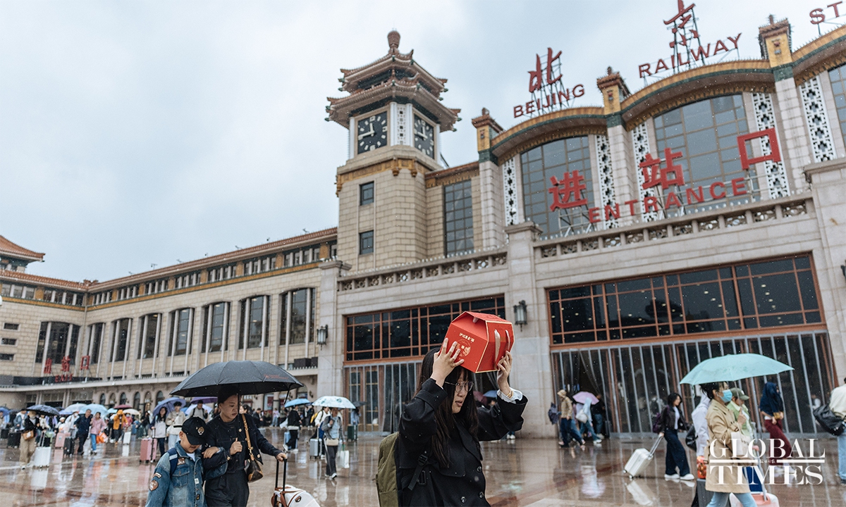 Rainy Return: Beijing railway stations see peak travel rush on the last day of holidays