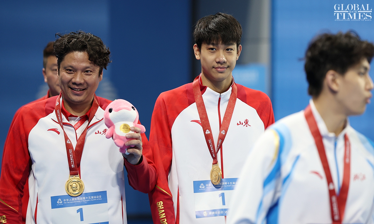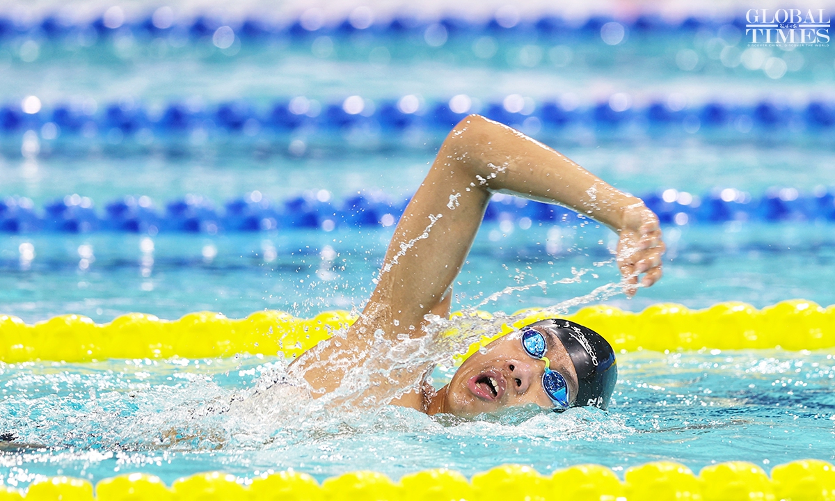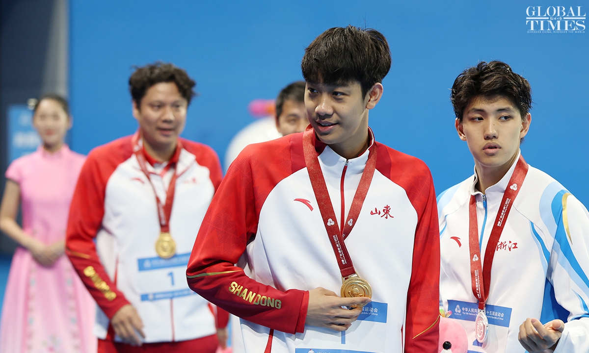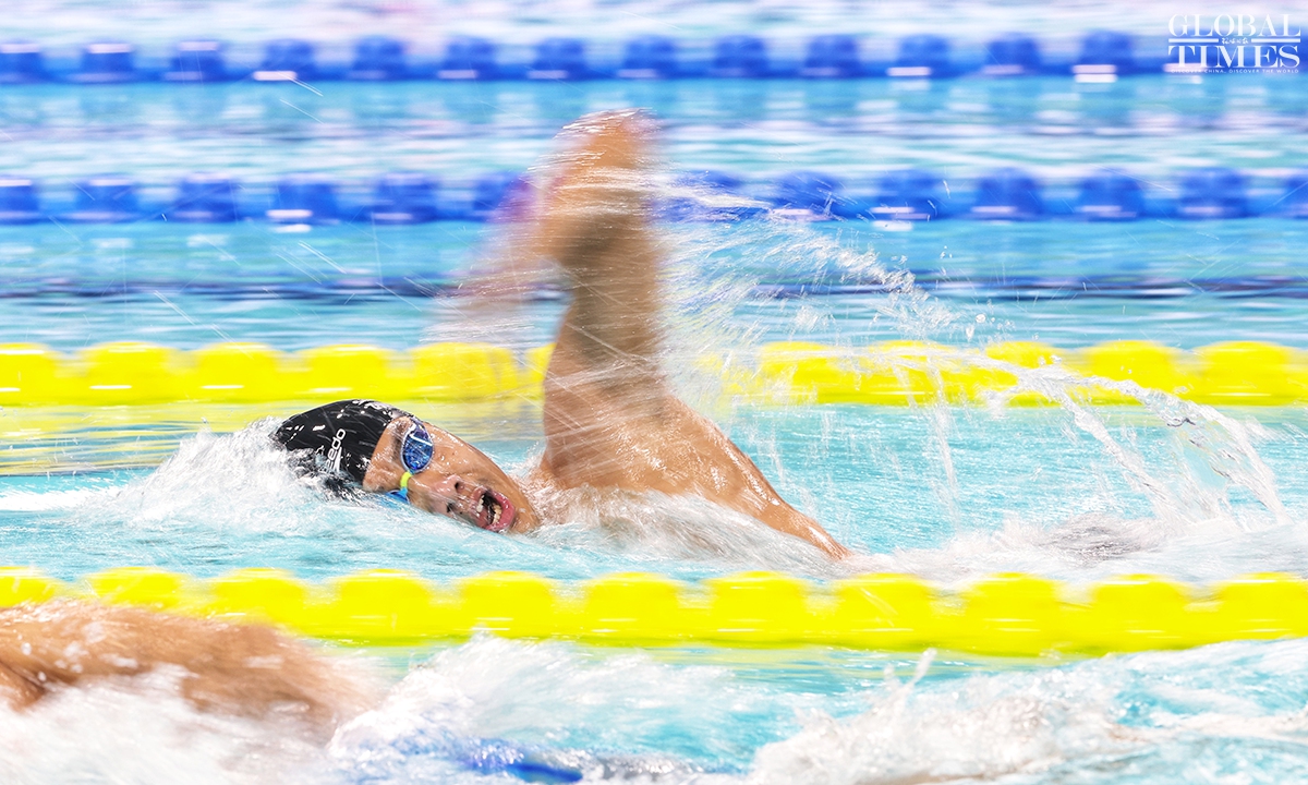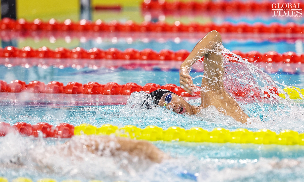 On Monday, Zhang Zhanshuo claimed victory in the men’s 1,500m freestyle final at the 15th National Games, clocking 14:52.73 to secure the gold medal. This triumph marks his fifth gold at the current Games. Photos: Cui Meng/GT