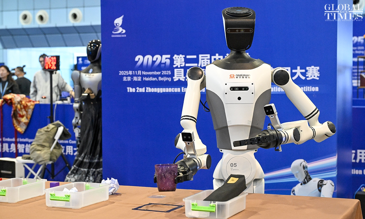 The finals of the 2025 2nd Zhongguancun Embodied Intelligence Robot Application Competition were held on Tuesday at the Zhongguancun Exhibition Center in Beijing. A total of 99 top teams from across China gathered in Zhongguancun to compete in 19 core tasks, vying for a total prize pool of 2 million yuan. The event aims to accelerate the application and development of embodied intelligence technologies in real-world scenarios. Photos: Chen Tao/GT