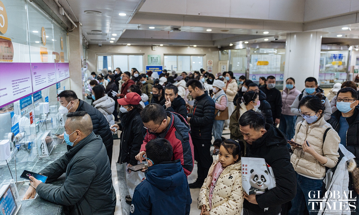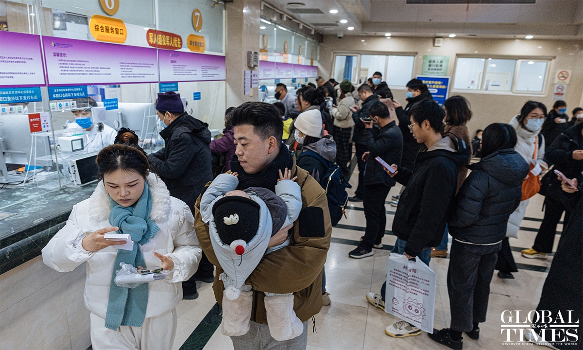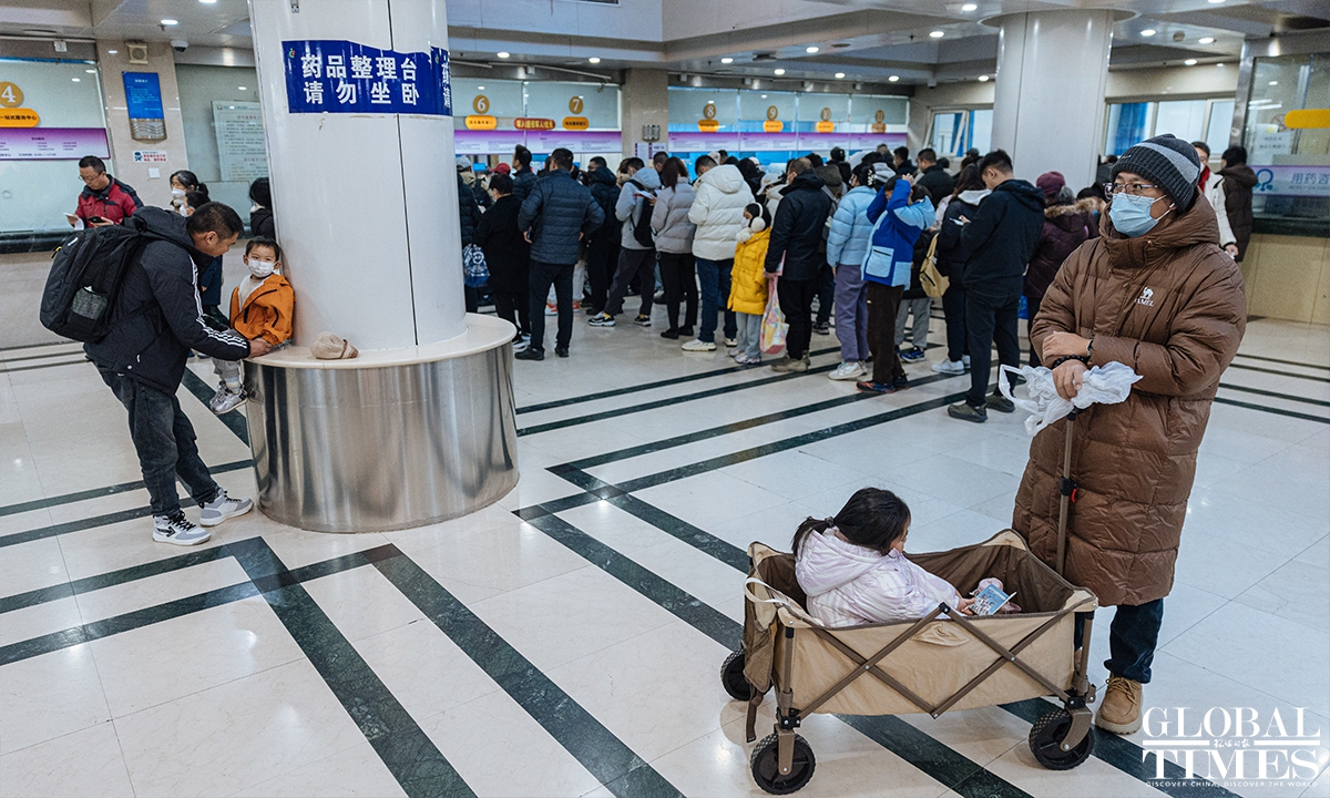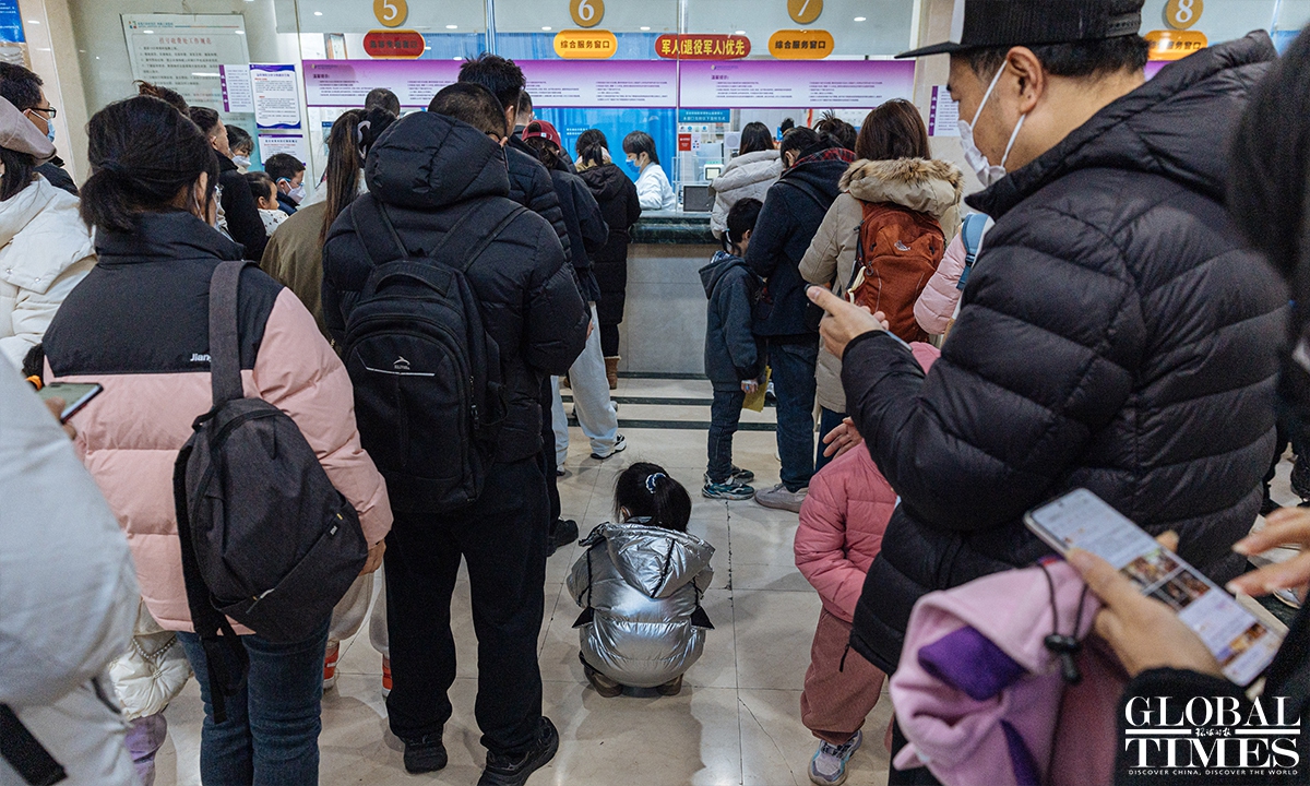 Photos taken on December 4, 2025 capture busy scenes at the Capital Center for Children's Health, Capital Medical University, where young patients and parents navigate crowded waiting areas seeking treatment during the winter flu season.