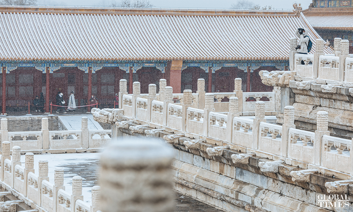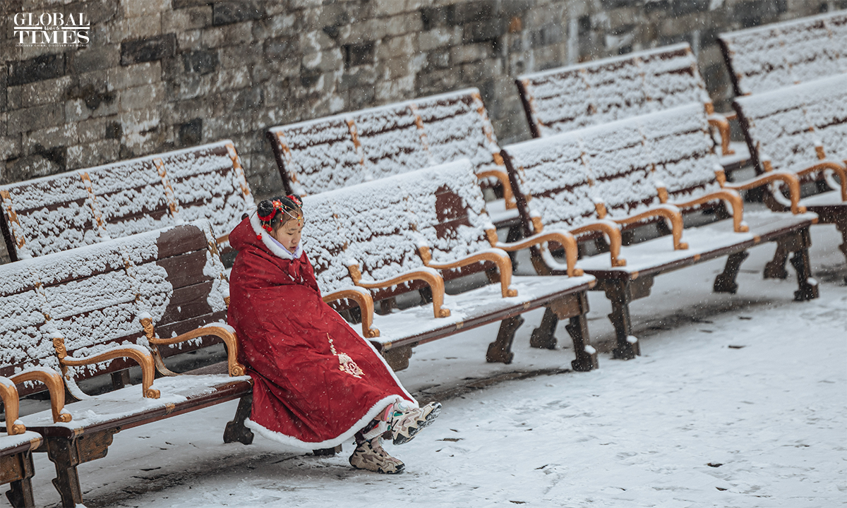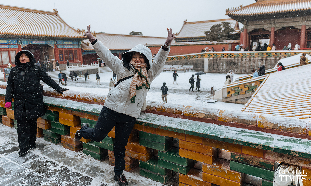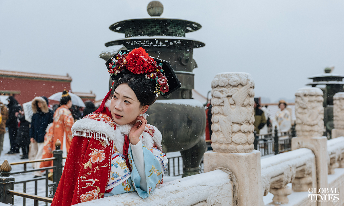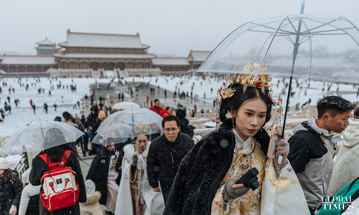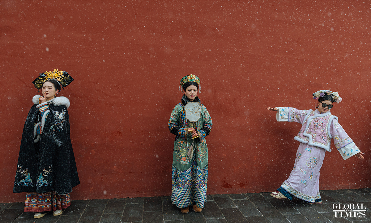 On December 12, Beijing saw its first snowfall of winter 2025. At the Palace Museum, visitors dressed in traditional costume strolled and took photos in front of the snow-covered ancient buildings. Photos: Li Hao/GT