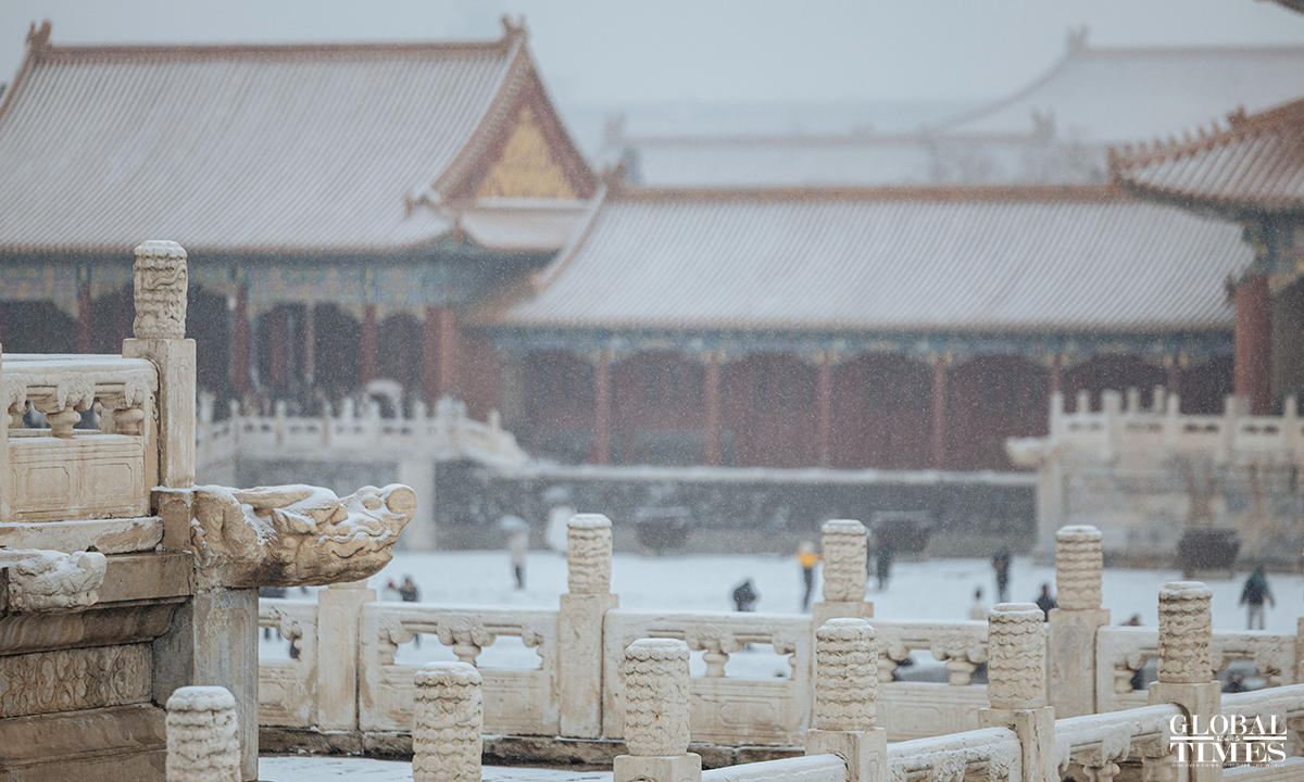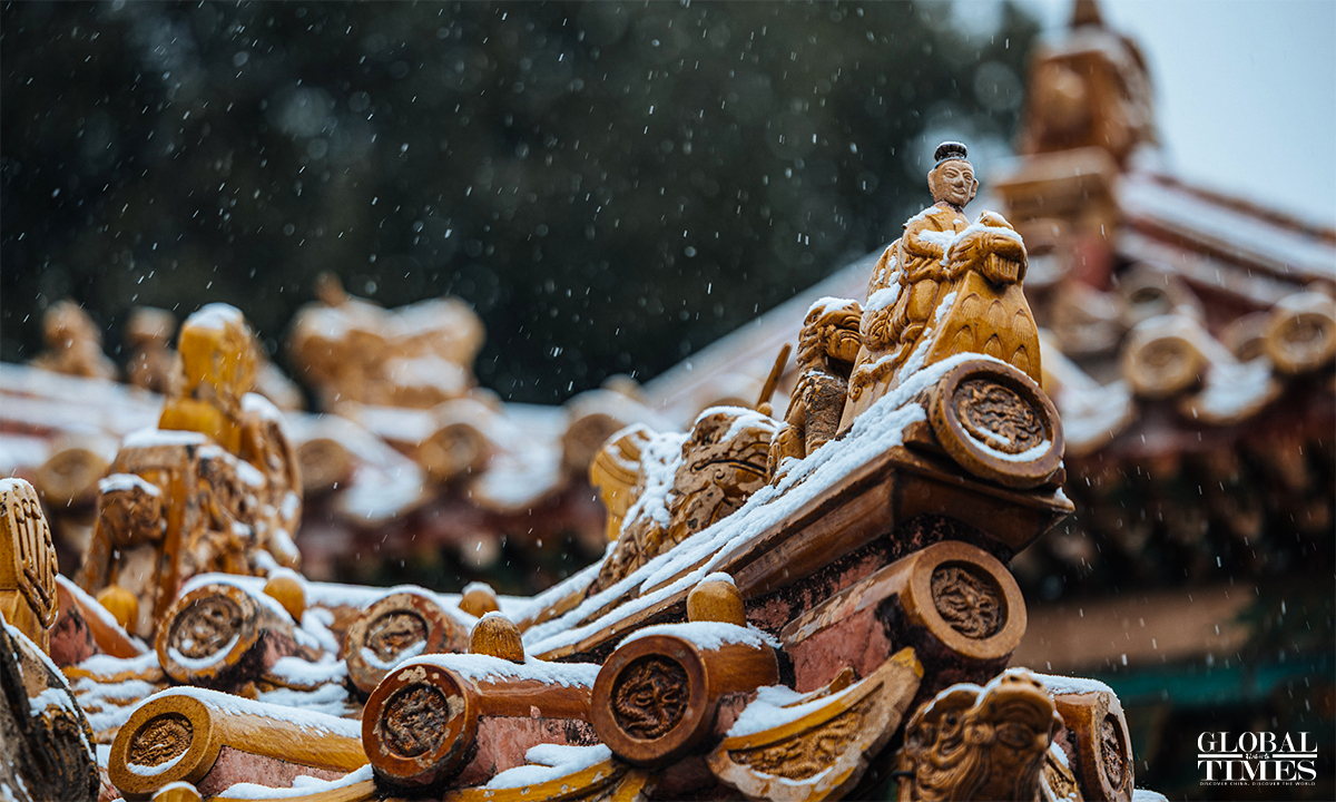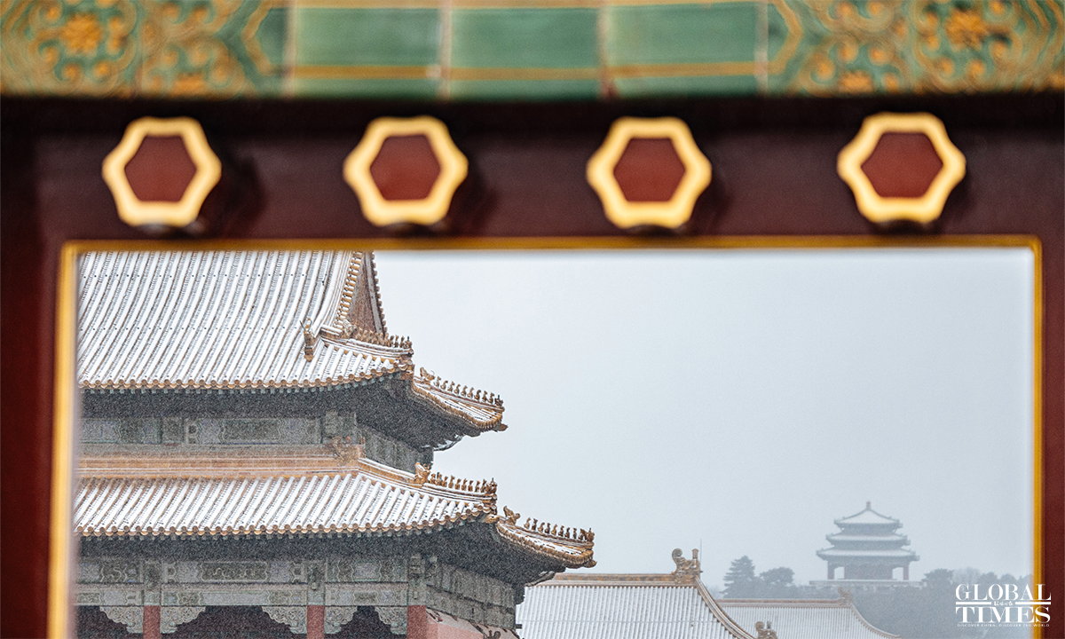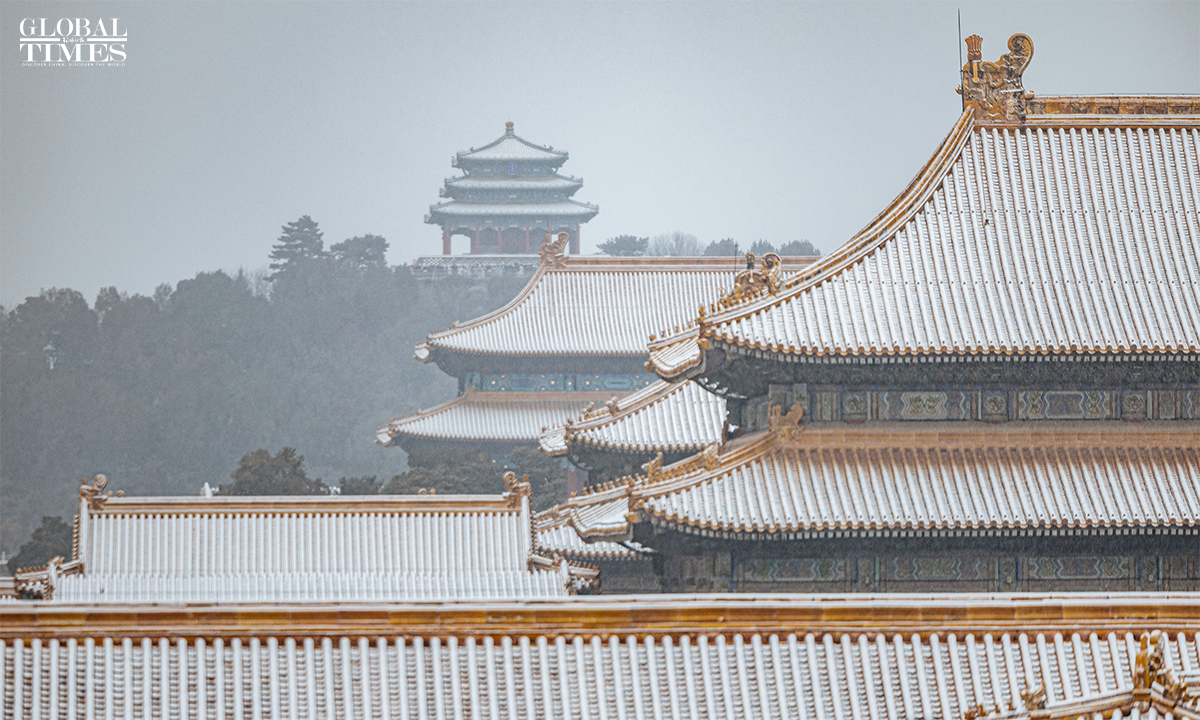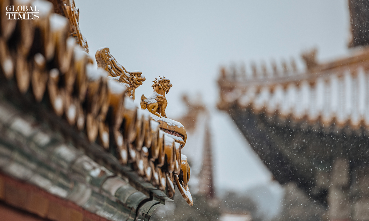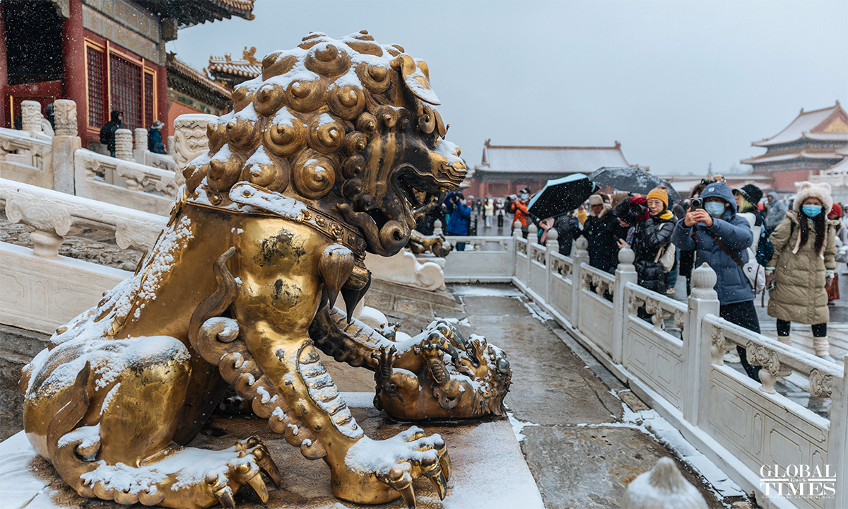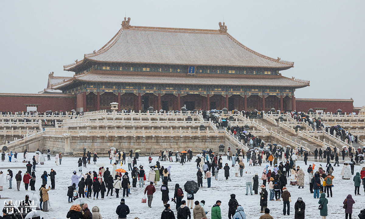 On December 12, Beijing saw its first snowfall of winter 2025. At the Palace Museum, visitors dressed in traditional costume strolled and took photos in front of the snow-covered ancient buildings. Photos: Li Hao/GT