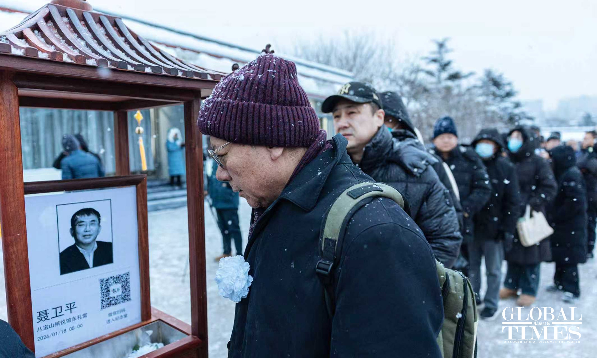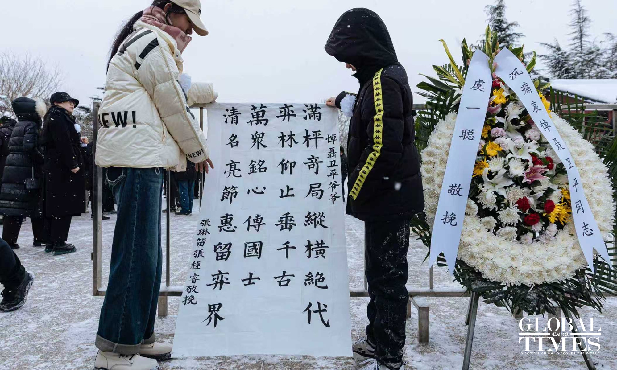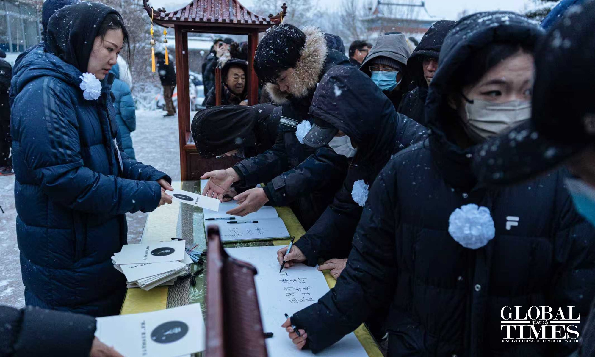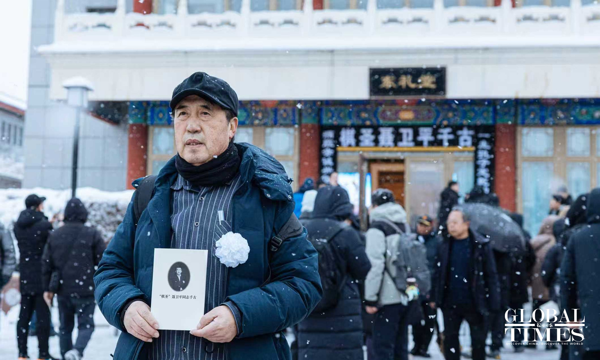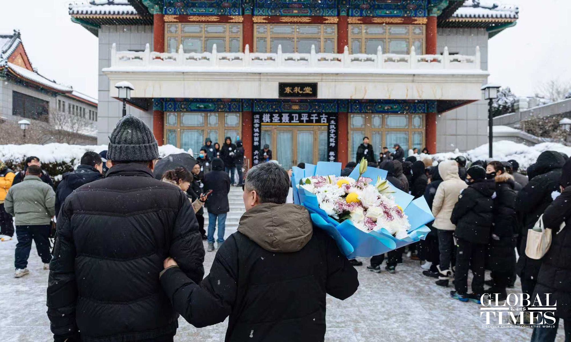 People braved the freezing cold and snow on Sunday morning in Beijing to que in line to bid their farewell to China’s revered Weiqi master Nie Weiping at the Babaoshan Funeral Home in Beijing. The "Weiqi Sage" Nie passed away on Wednesday at the age of 74. Photos: Li Hao/GT