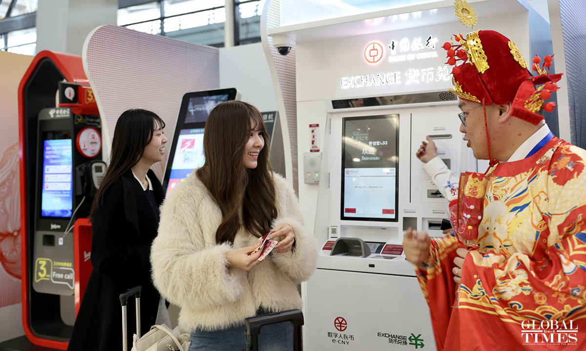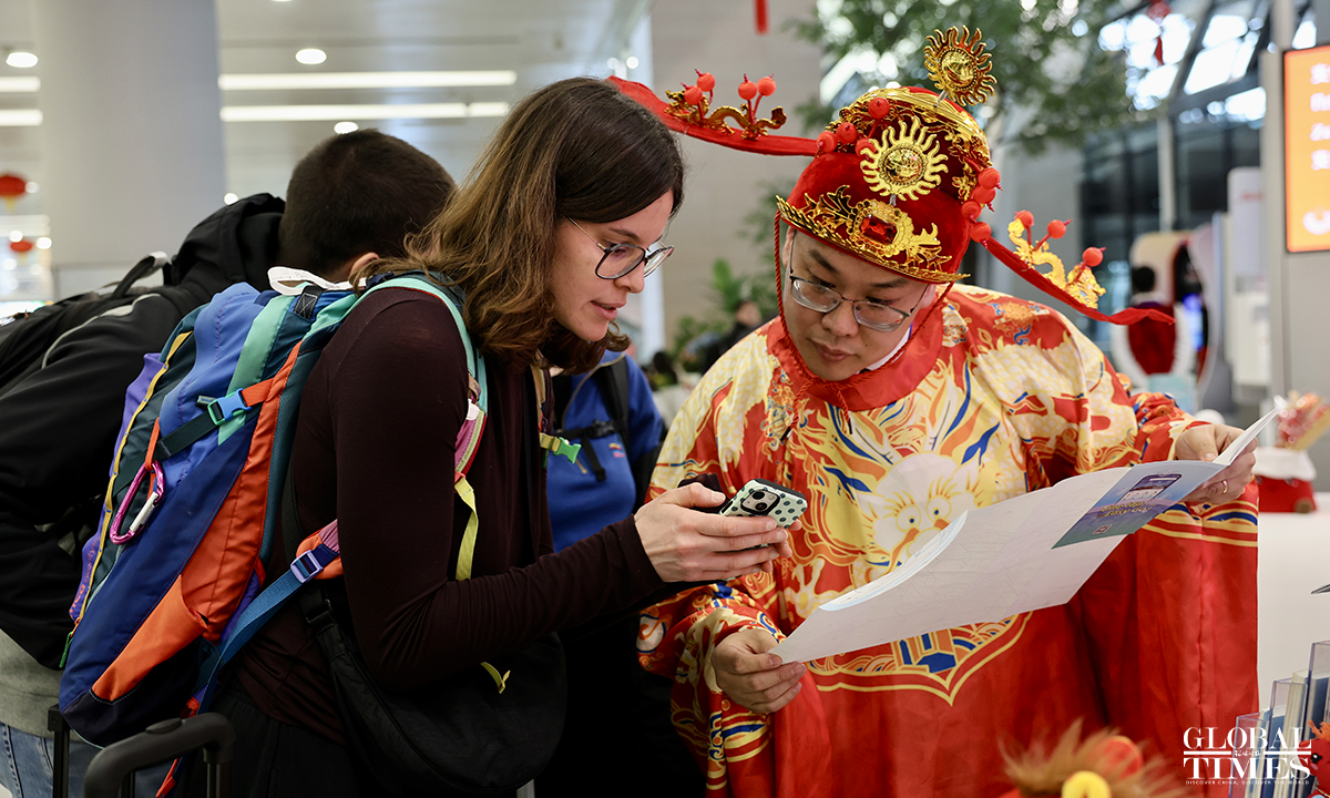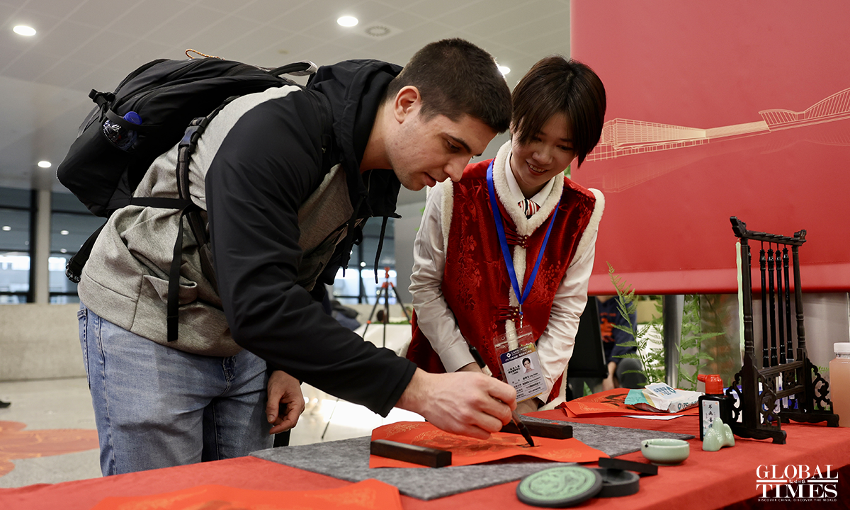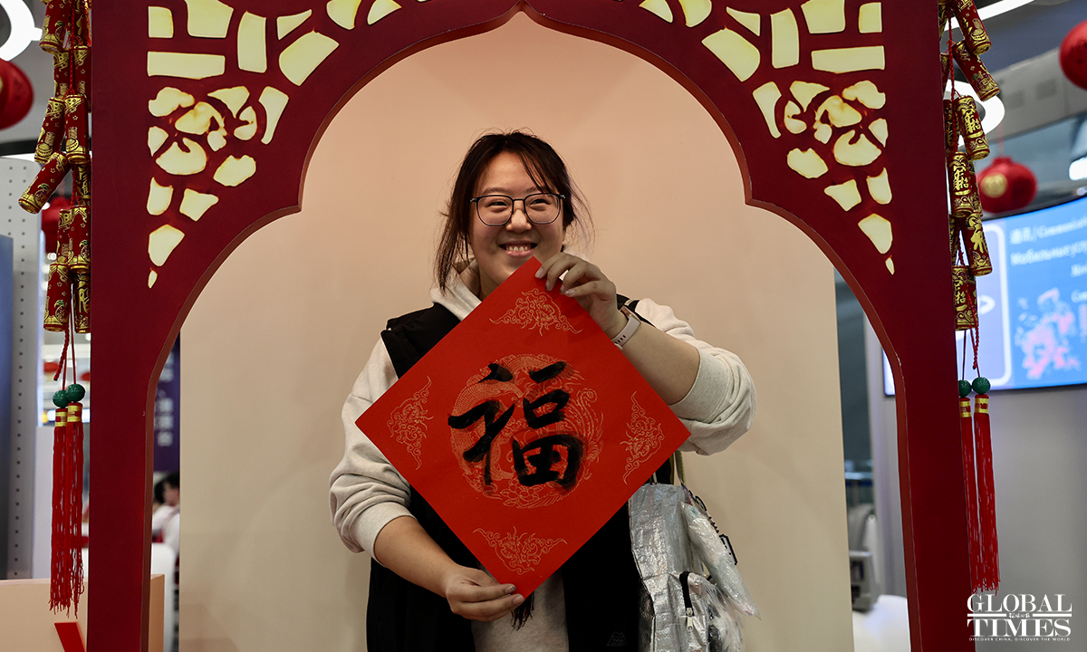 A Chinese New Year flash event was held at the International Services Shanghai, the one-stop service center for foreigners at Terminal 2 of Shanghai Pudong International Airport on February 5, 2026. Foreign friends on site participated in interactive experiences such as learning New Year greetings in Shanghai dialect, writing the Chinese character "Fu" (meaning "good fortune"), and trying traditional rubbing printing. Through these engaging activities, they immersed themselves in the customs and culture of the Chinese New Year, joyfully welcoming the upcoming Spring Festival. Photos: Chen Xia/GT