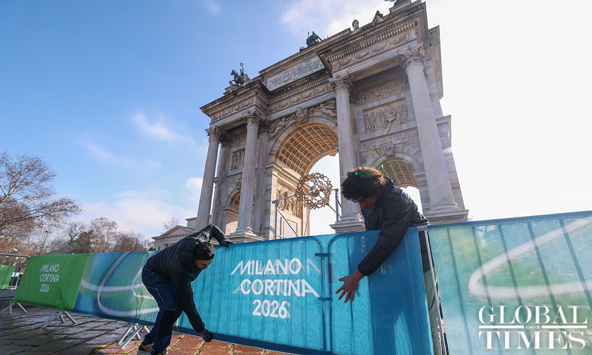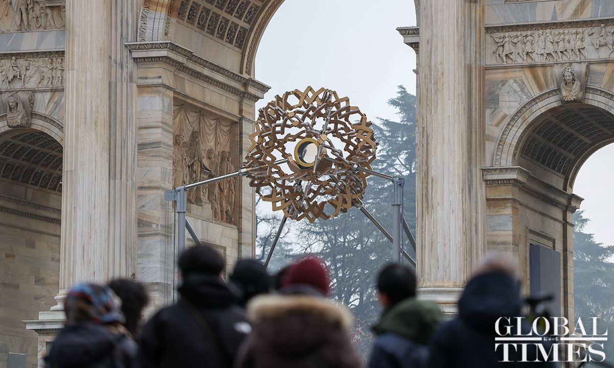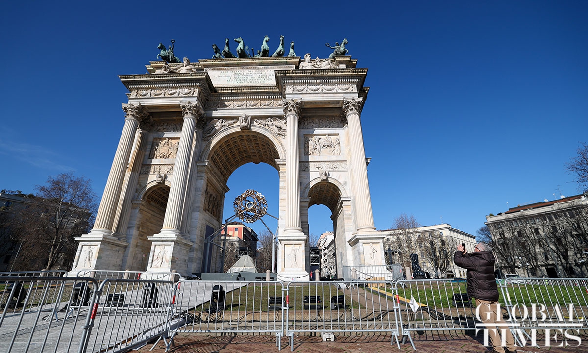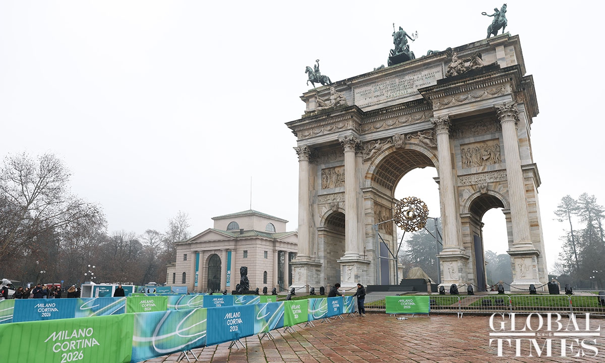 The installation around the cauldron for the Milano-Cortina 2026 Winter Olympics at Milan’s Arco della Pace has been largely completed and is now awaiting lighting at the Opening Ceremony. Photos: Chen Tao/GT