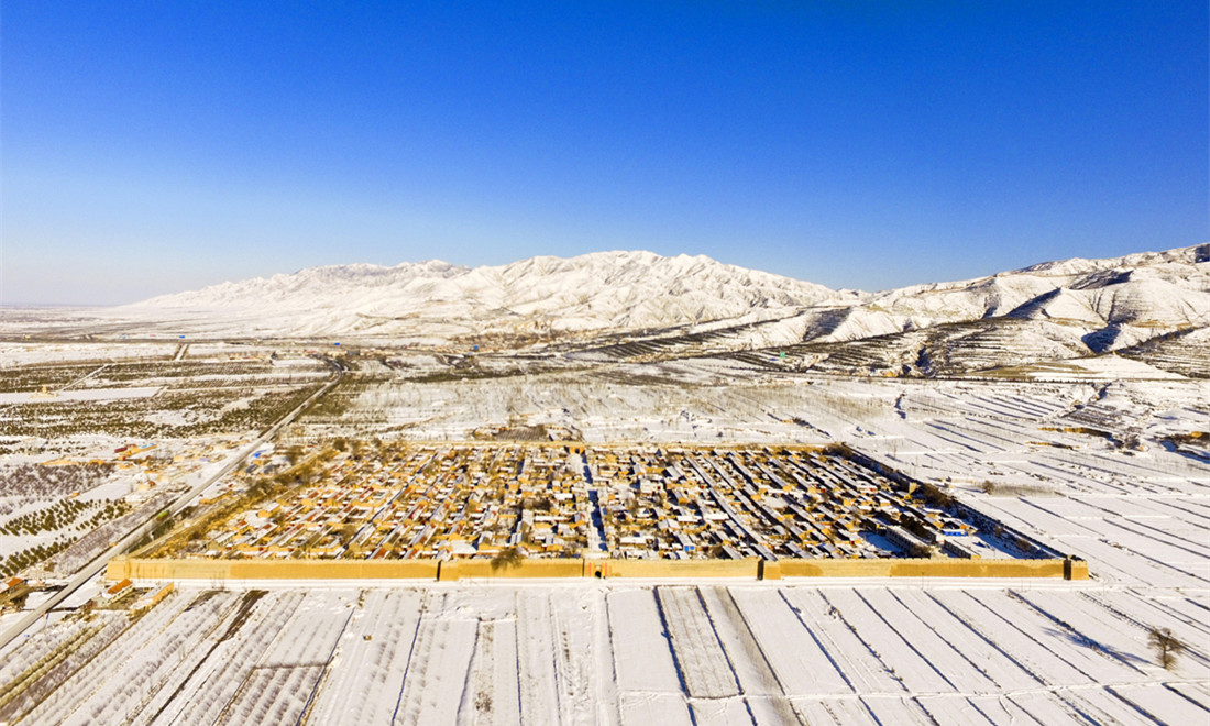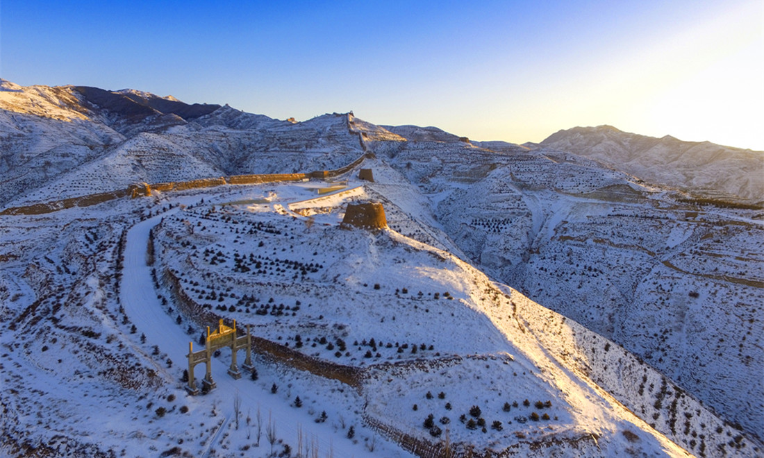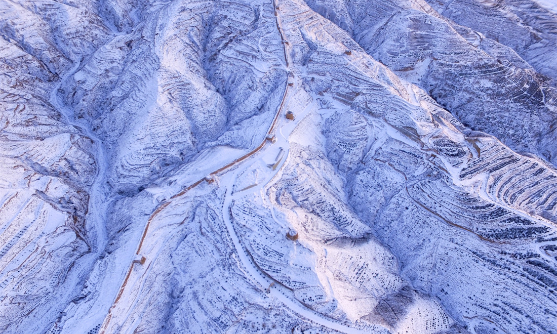 A bird's-eye view of the Guangwu Great Wall reveals the hills covered in snow. Photo: Courtesy of Zhang Xiangdong/Wallstime figcaption >