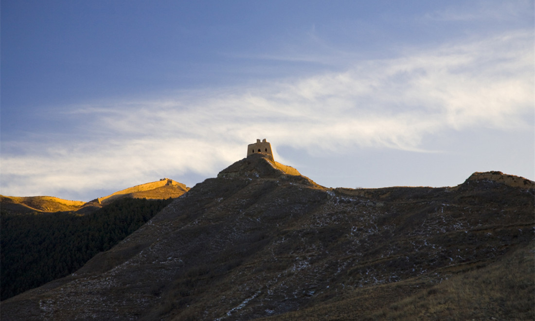A guard tower on the Guangwu Great Wall juts out from the horizon. Photo: Courtesy of Zhang Xiangdong/Wallstime figcaption >