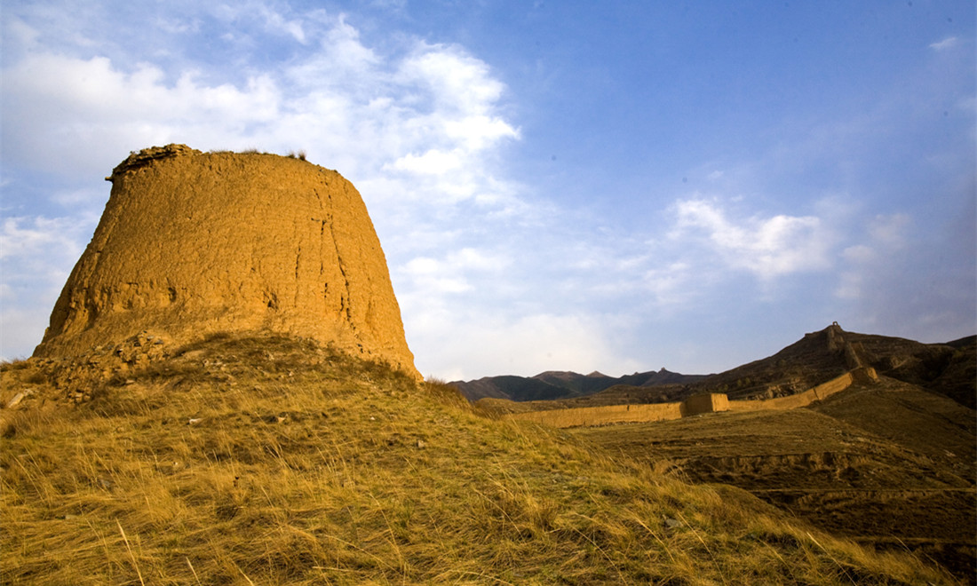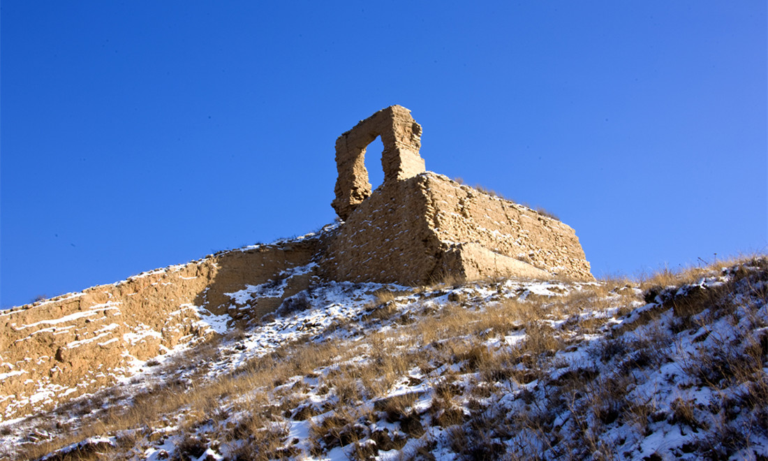 A lone guard tower sits among the ruins of the Guangwu Great Wall. Photo: Courtesy of Zhang Xiangdong/Wallstime figcaption >