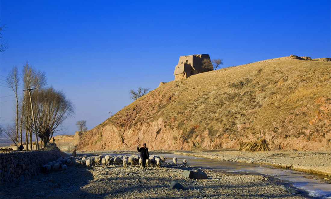 A guard tower on the Guangwu Great Wall sits atop a hill as a shepherd tends to his flock below. Photo: Courtesy of Zhang Xiangdong/Wallstime figcaption >