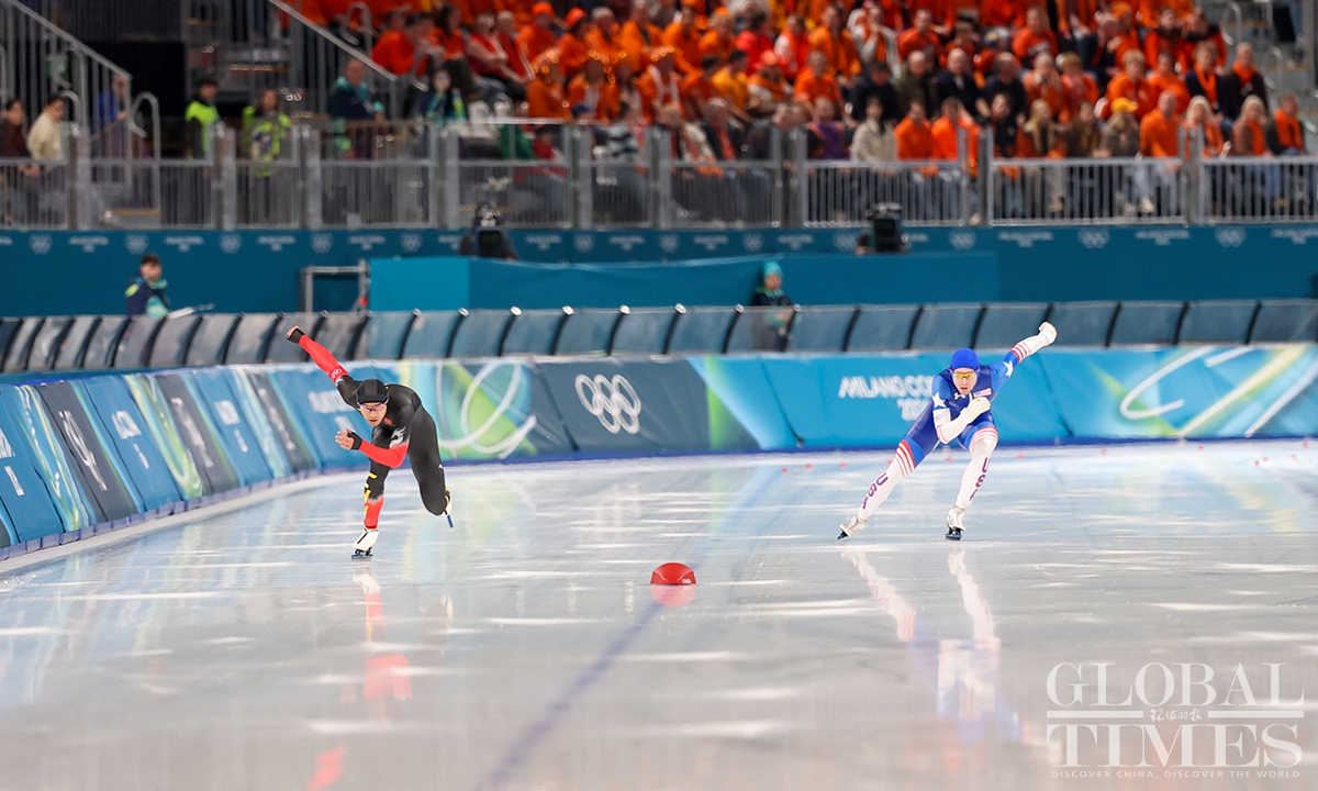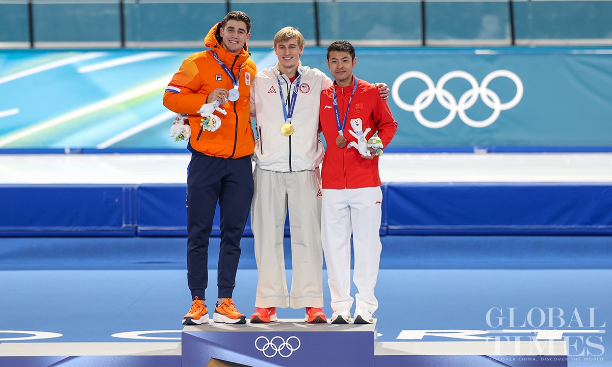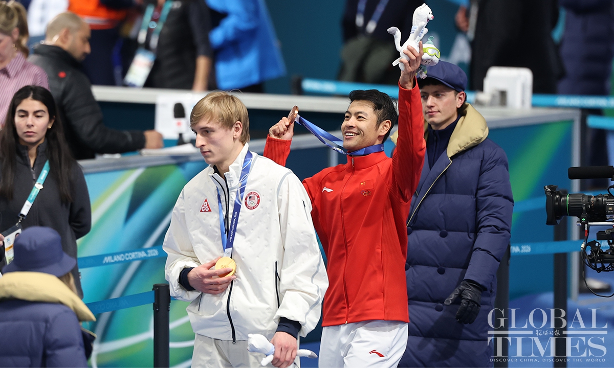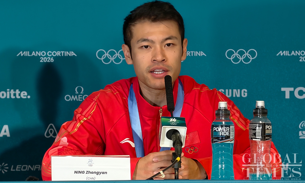 Local time on February 11, the Milano Cortina Winter Olympics men's 1000m speed skating final was held in Milan. China's Ning Zhongyan clocked 1:07.34 - his best low-altitude time of the season - to secure his first Olympic podium. Jordan Stolz of the United States took gold in 1:06.28, breaking the previous Olympic record set by Dutch skater Gerard van Velde at Salt Lake City 2002. (Photo: Chen Tao/ Global Times)