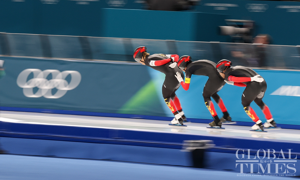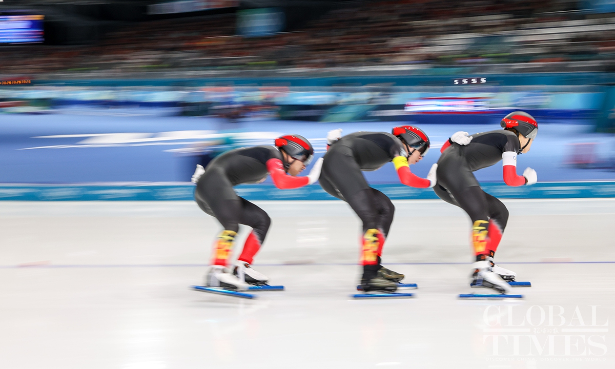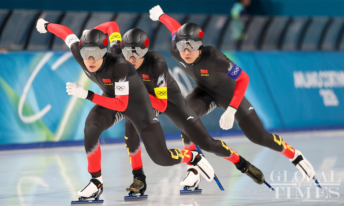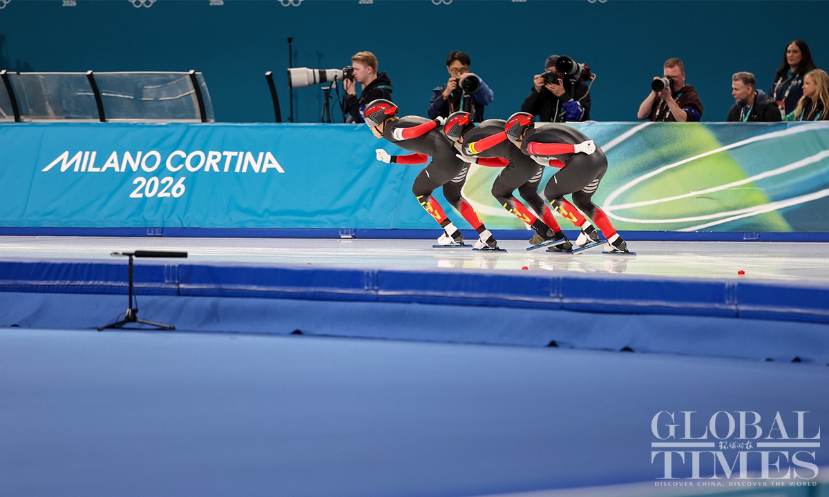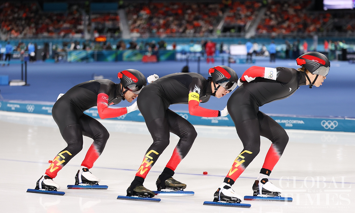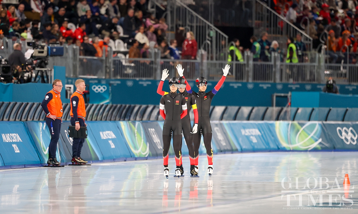 On February 17, local time, at the Milan-Cortina Winter Olympics, China beat the Netherlands in the final B to win the bronze medal of the men's team pursuit. Liu Hanbin, Wu Yu and Li Wenhao clocked 3 minutes and 41.38 seconds to claim the best finish by China in this event. (Photos: Chen Tao/Global Times)