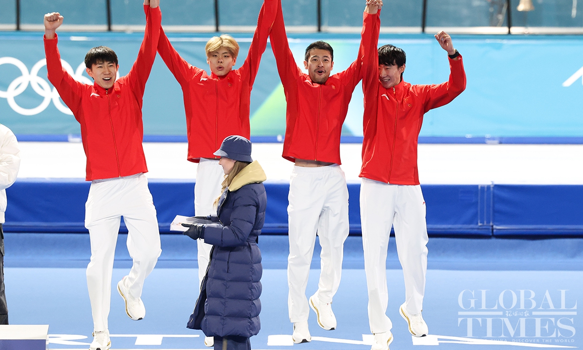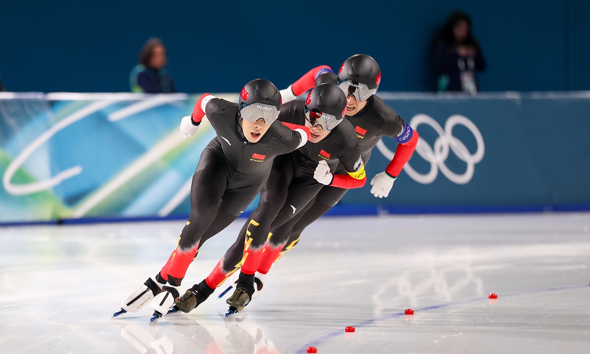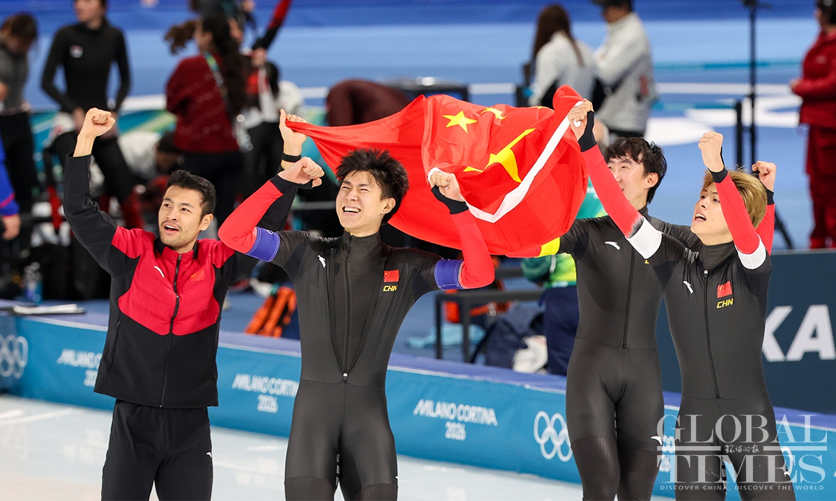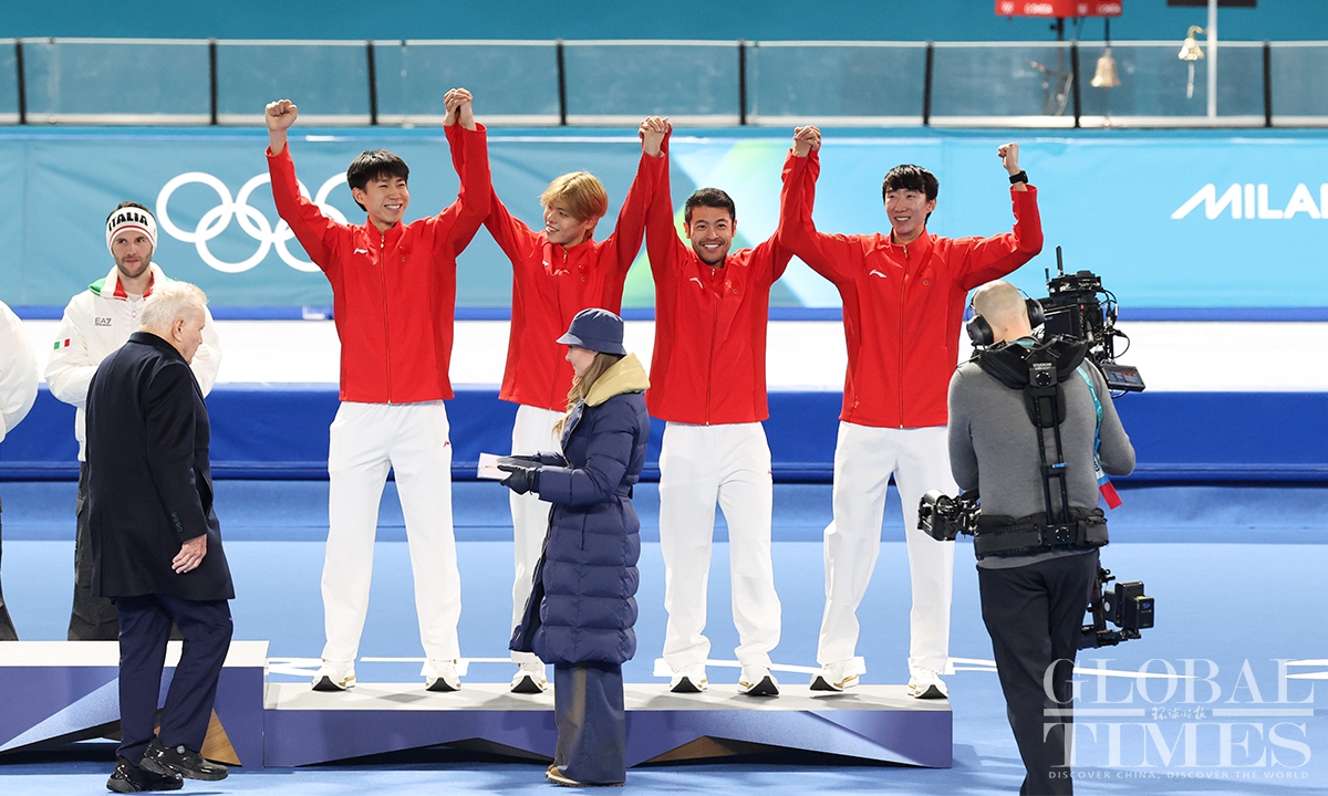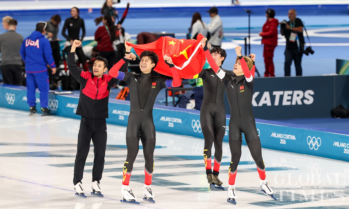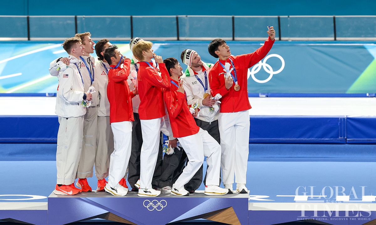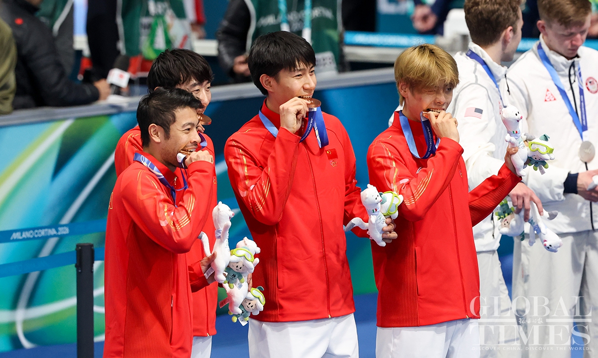 On February 17, local time, at the Milan-Cortina Winter Olympics, China beat the Netherlands in the final B to win the bronze medal of the men's team pursuit. Liu Hanbin, Wu Yu and Li Wenhao clocked 3 minutes and 41.38 seconds to claim the best finish by China in this event. (Photos: Chen Tao/Global Times)