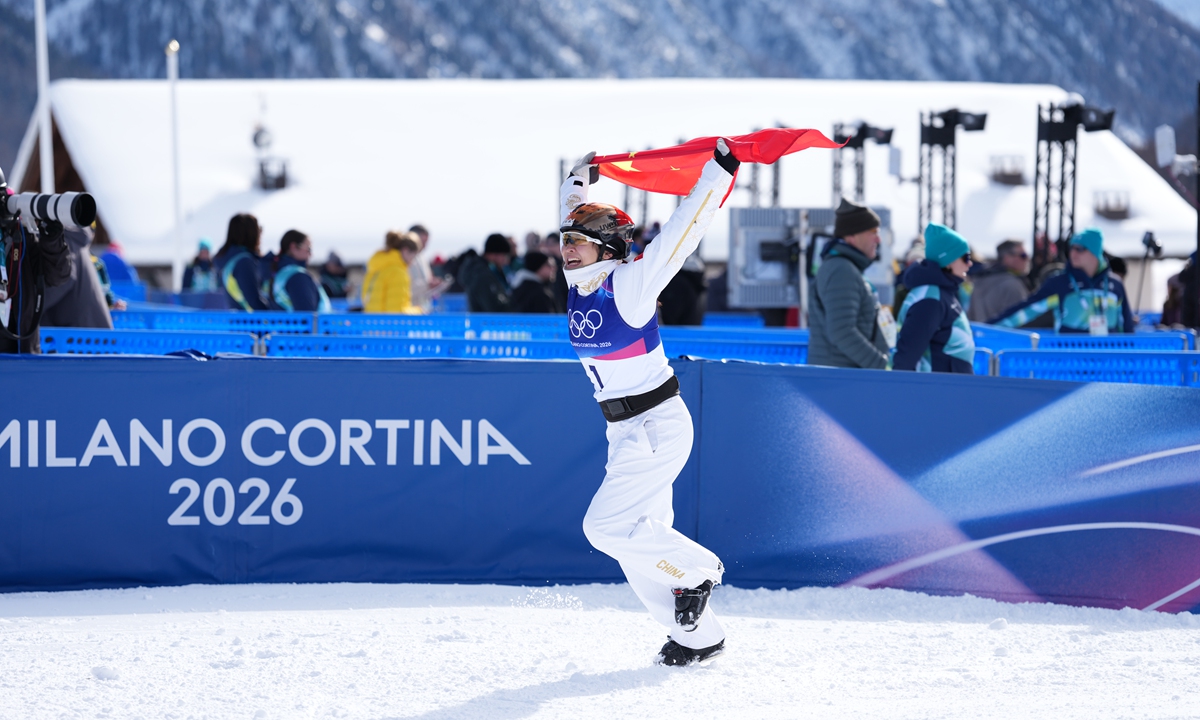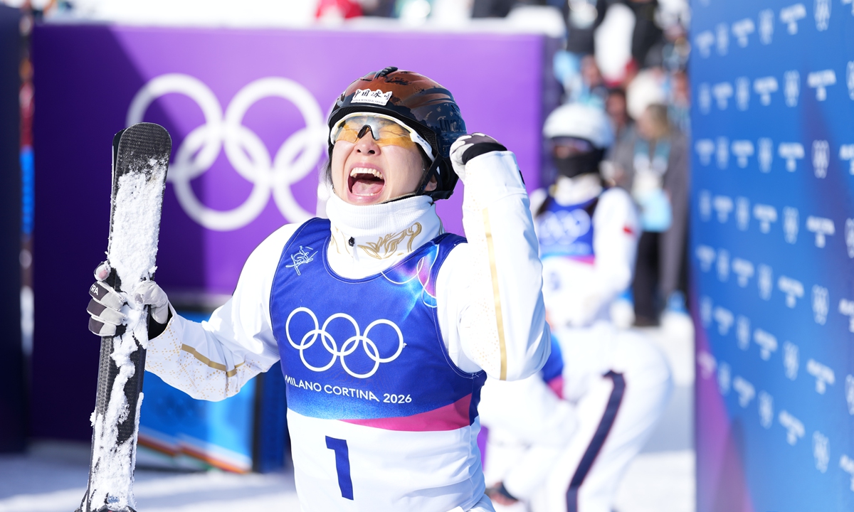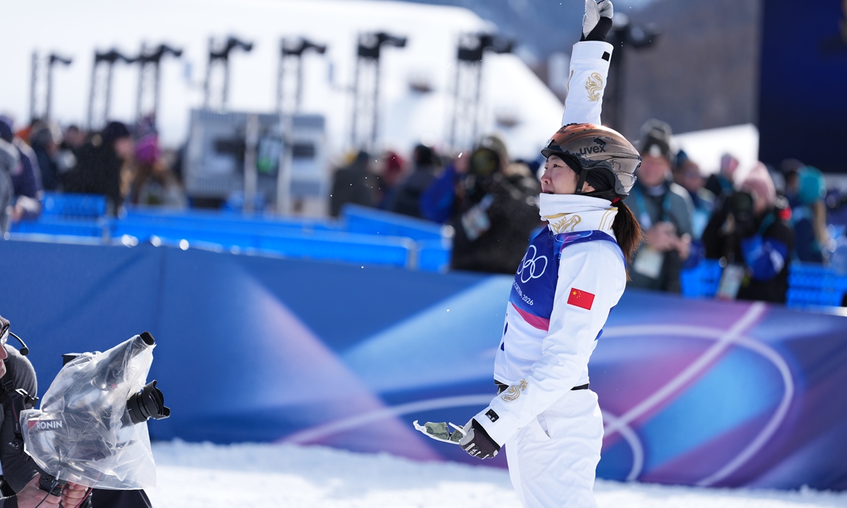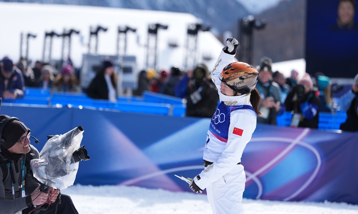 China's Xu Mengtao wins women's freeski aerials at Milan-Cortina Winter Olympics on February 18, 2026. This is the second gold medal for the Chinese delegation. Photo: Wang Liang/People's Daily figcaption >