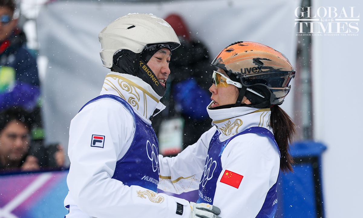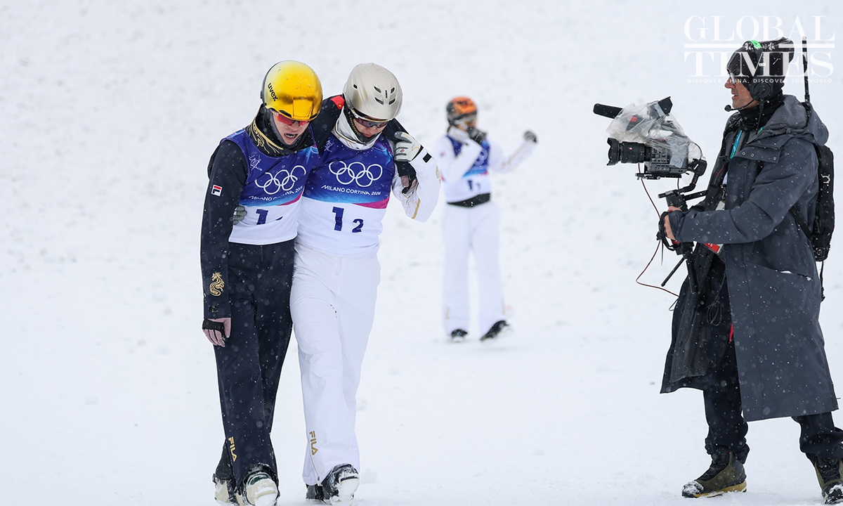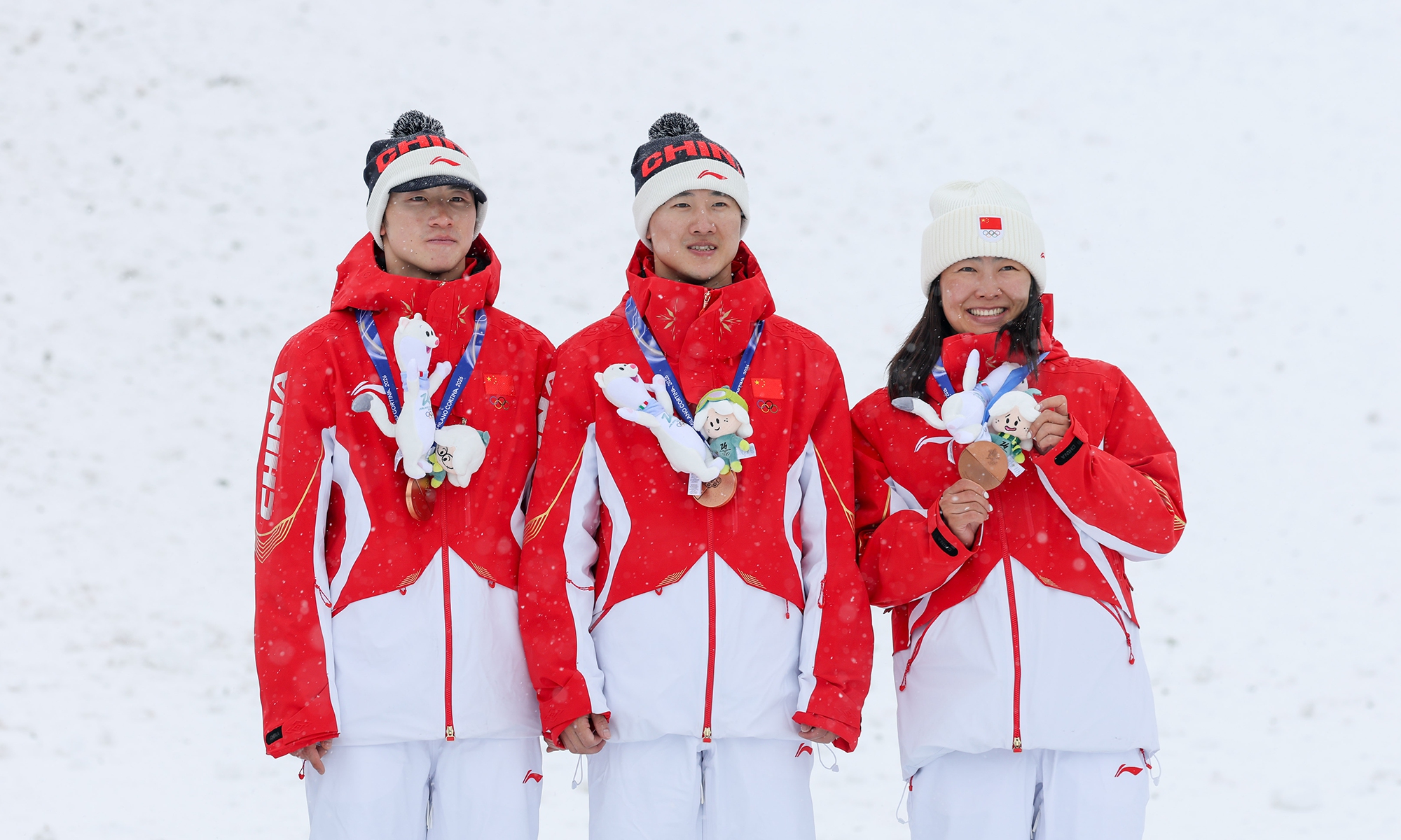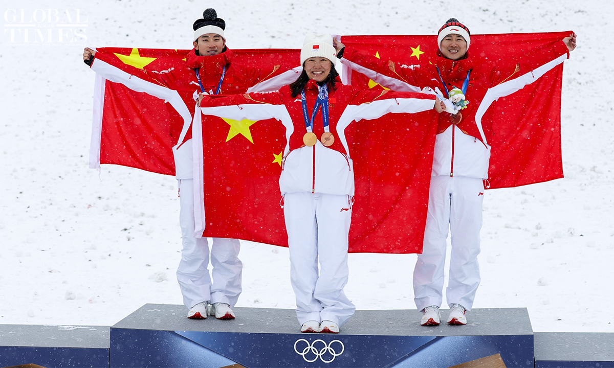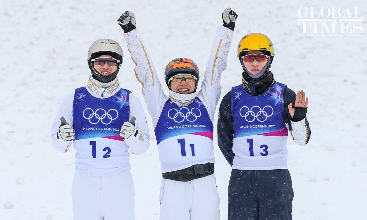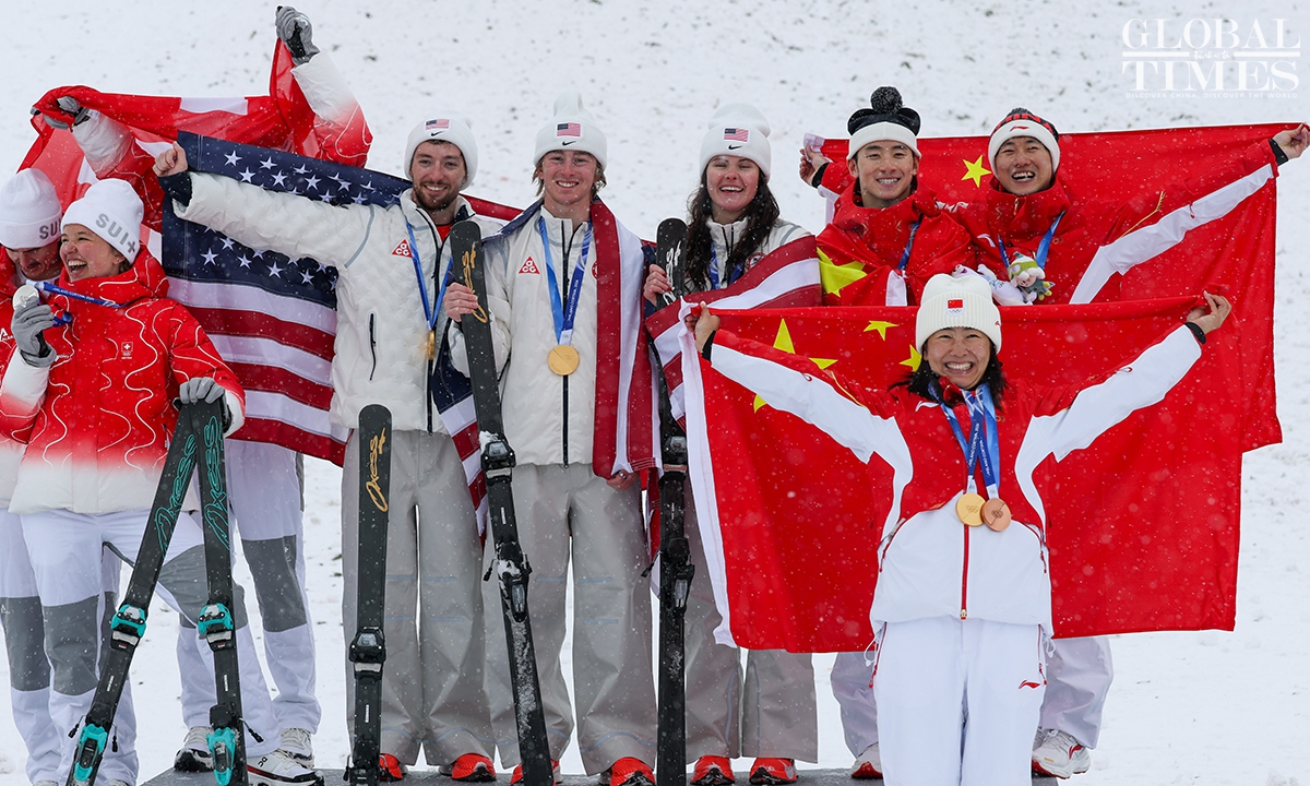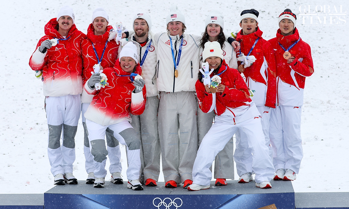 China won the bronze medal in the freestyle skiing mixed team aerials of the Milan-Cortina Winter Olympics on February 21. The Chinese trio of Xu Mengtao, Wang Xindi and Li Tianma scored a combined 279.68 points to secure a place on the podium. Team USA defended its title to take gold, while Switzerland finished second to claim silver. Photos: Chen Tao/GT