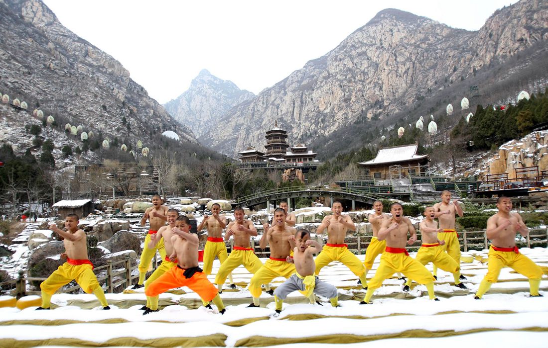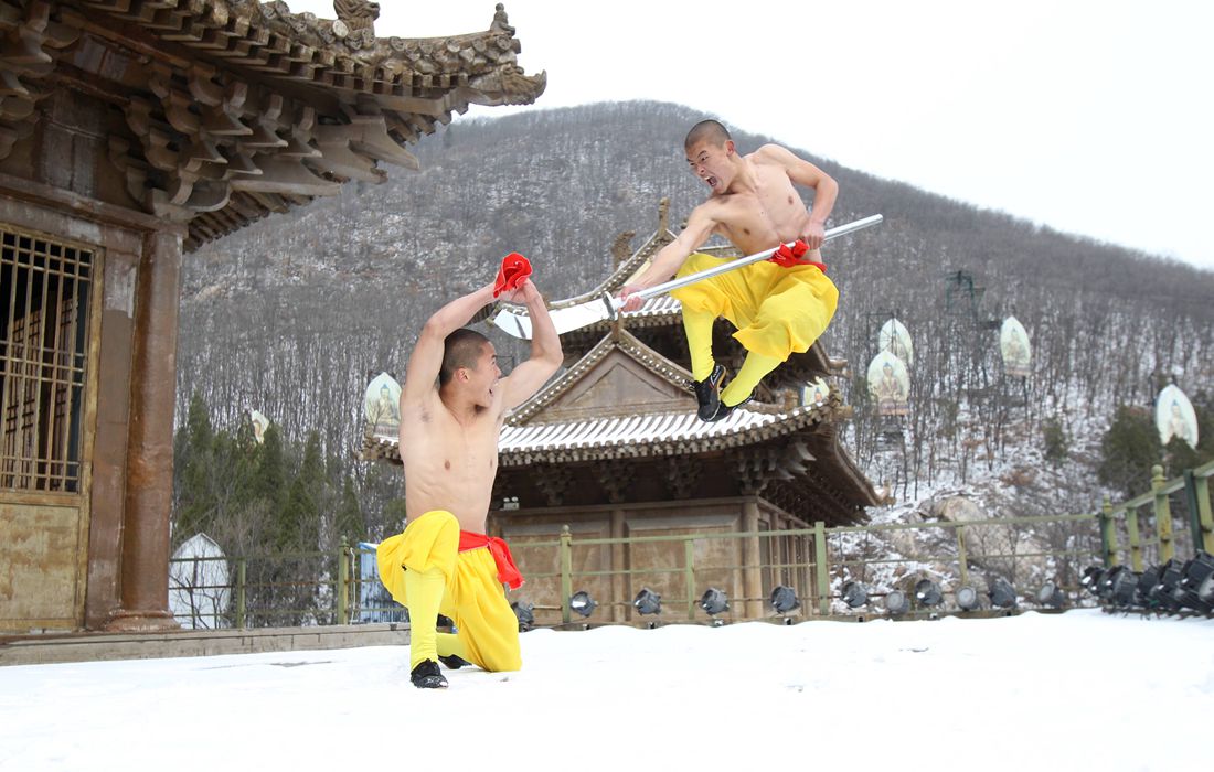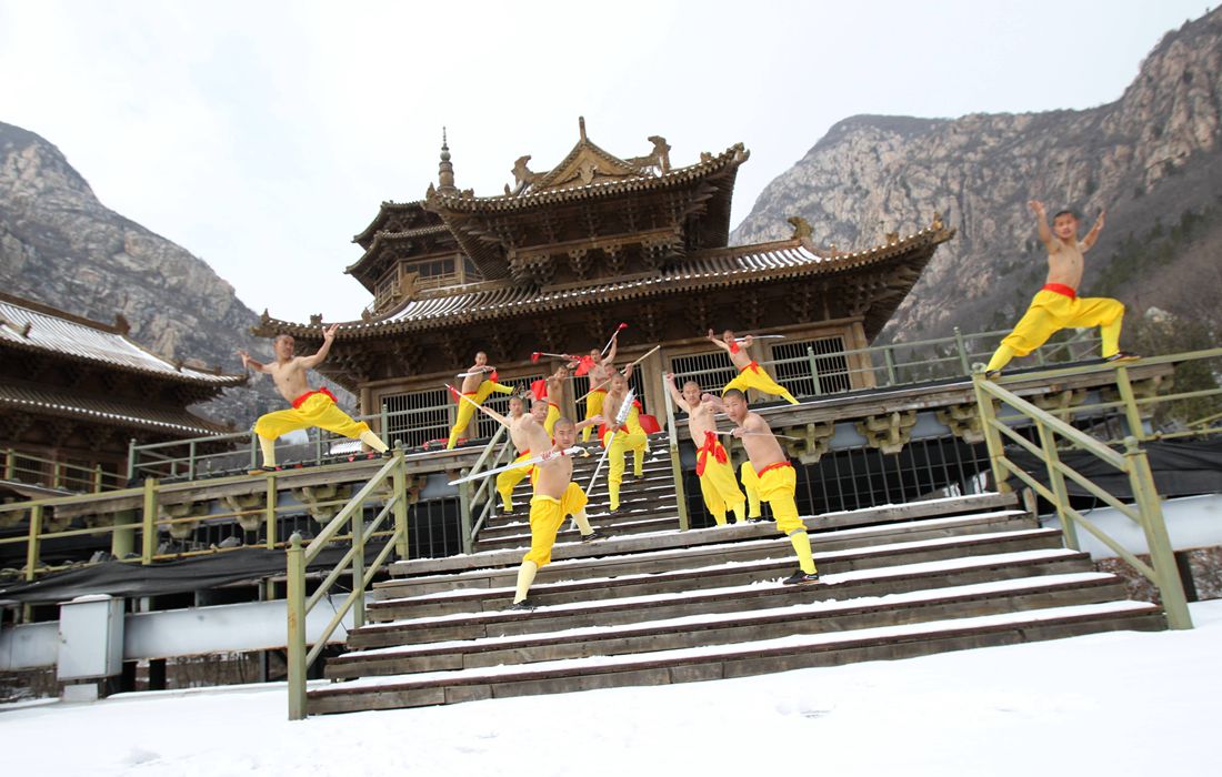 Shirtless monks show off their stuff at snowy Shaolin Temple