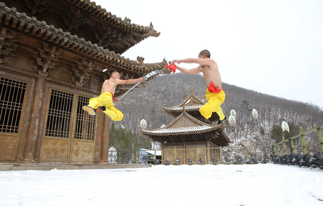 Shaolin Monks demonstrate their martial arts skills in a snowy field at Shaolin Temple of Songshan Mountain as a cold front swept Central China's Henan Province on February 22, 2017. Photo: CFP figcaption >