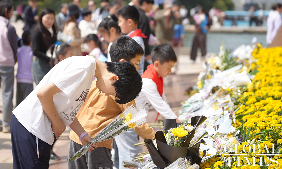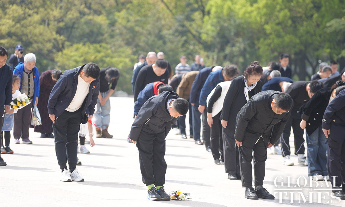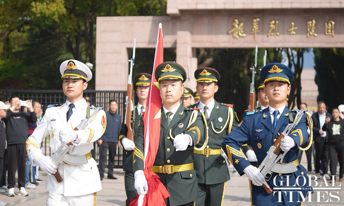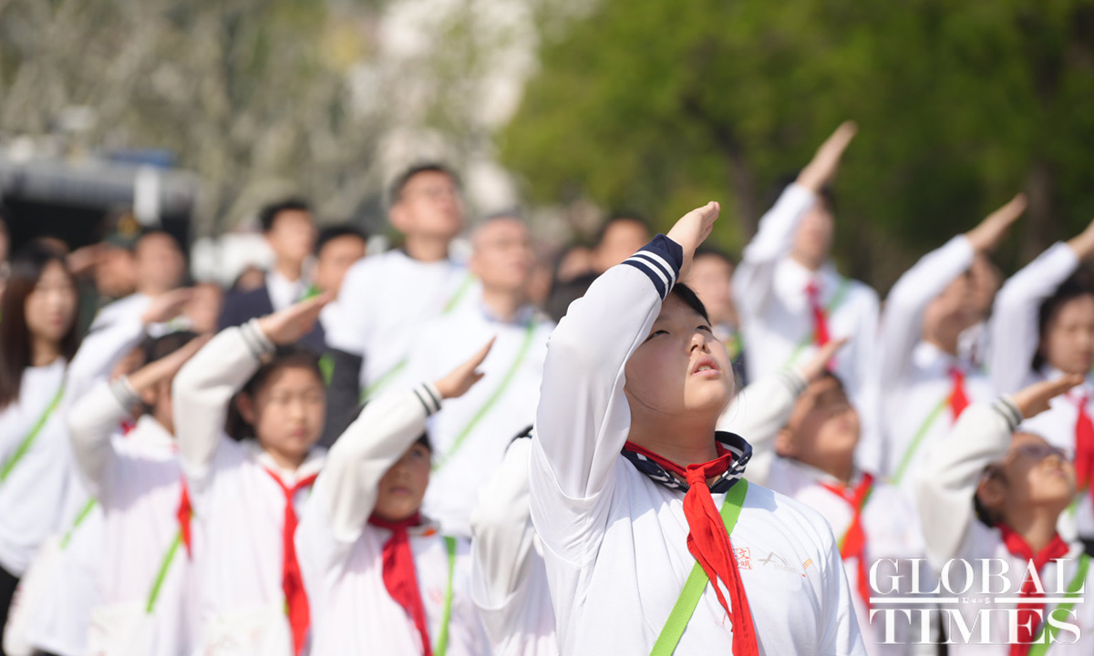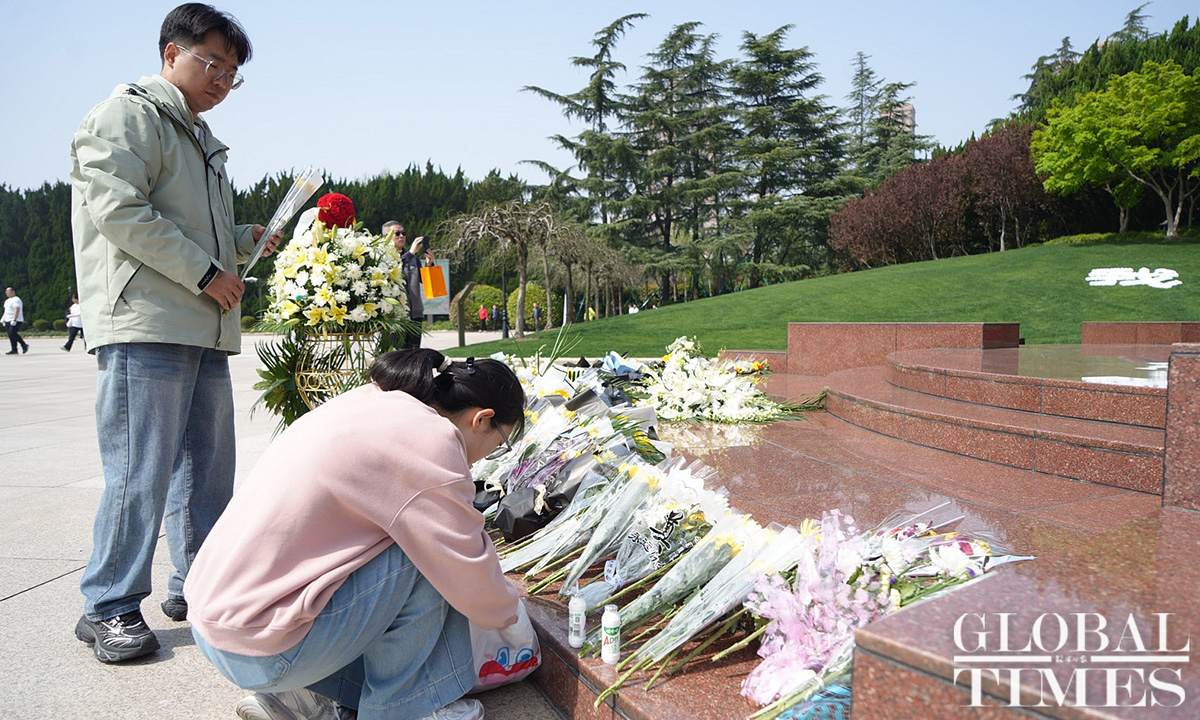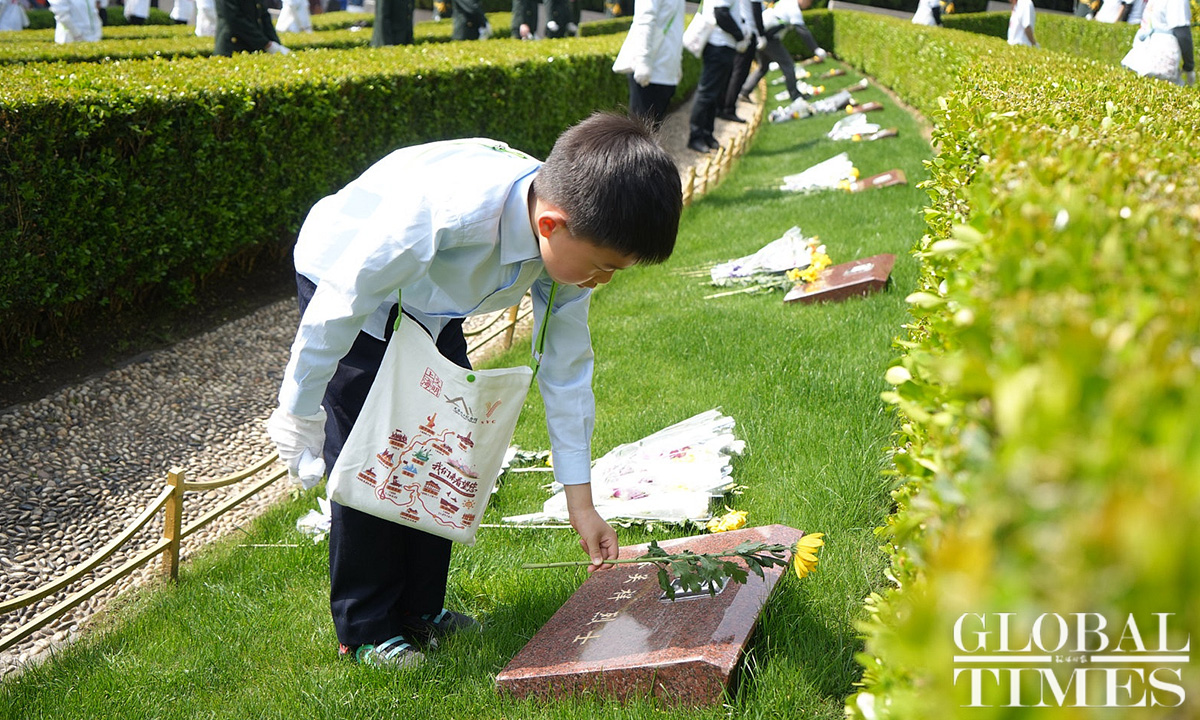 Commemorative activities were held at the Shanghai Longhua Martyr Cemetery and several martyr memorial venues across Shanghai on Sunday to honor the revolutionary martyrs who sacrificed their lives for China’s national independence and development. Approximately 200 people attended the commemoration at the Shanghai Longhua Martyr Cemetery, including youth representatives from local schools, representatives from revolutionary families, and active-duty military personnel and veterans. Sunday marked this year’s Qingming Festival, also known as Tomb Sweeping Day, a traditional Chinese festival during which people pay tribute to the decreased and honor their ancestors. (Photos: Lu Ting/GT)