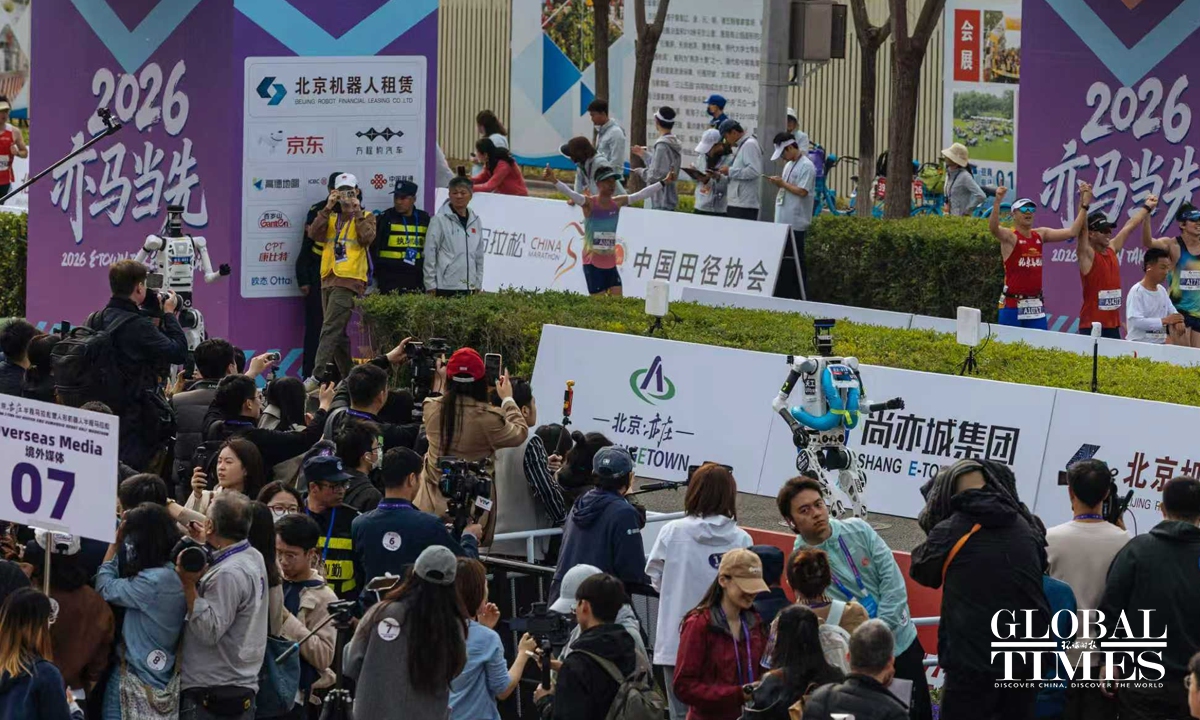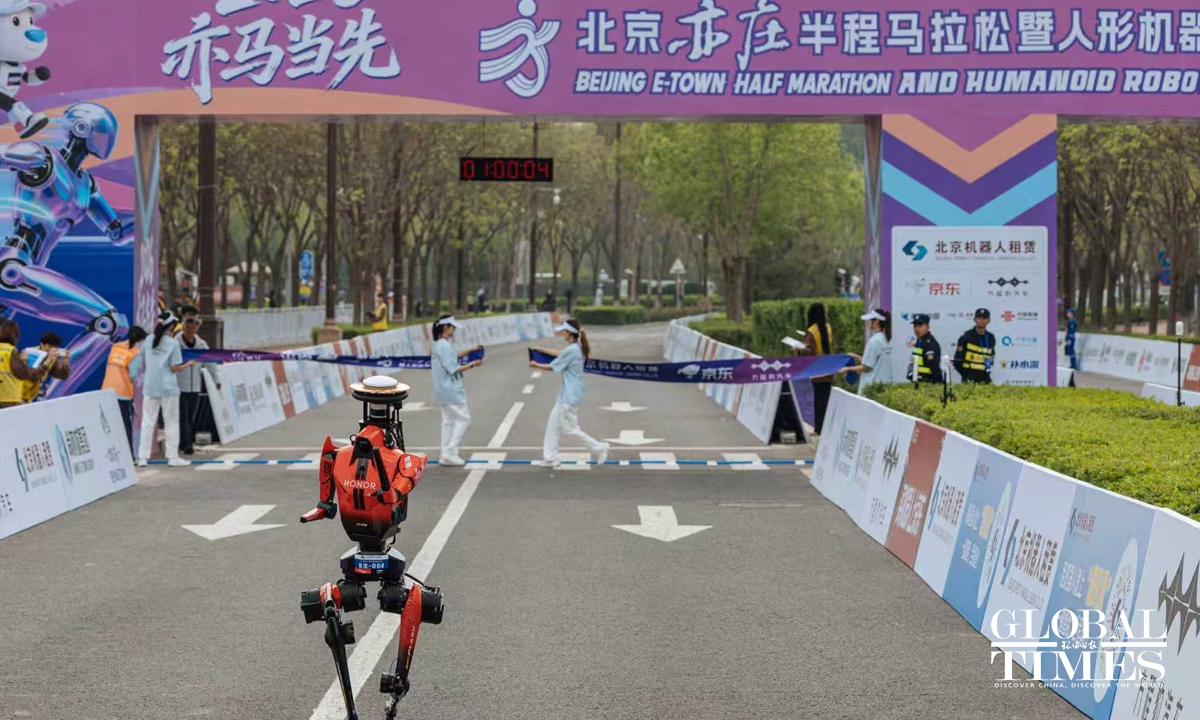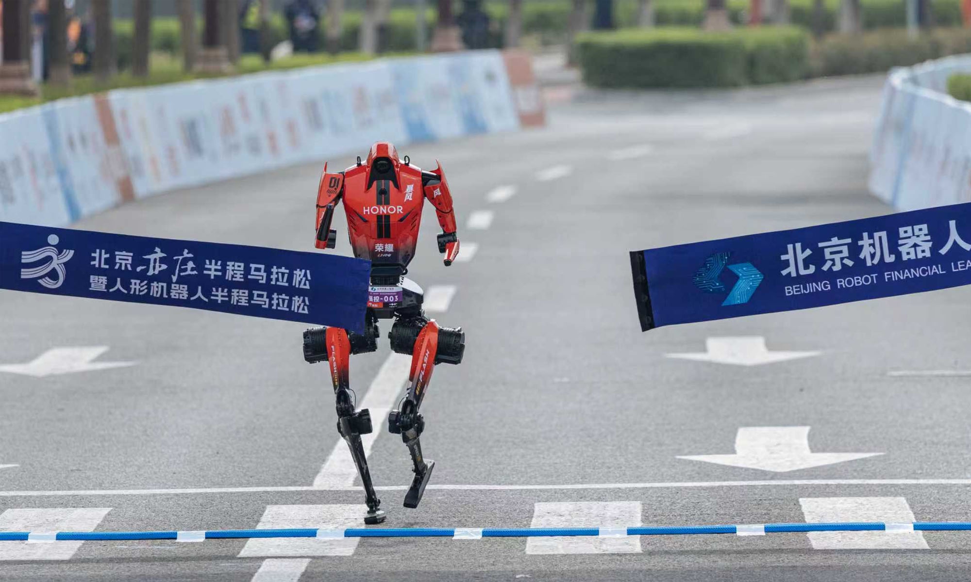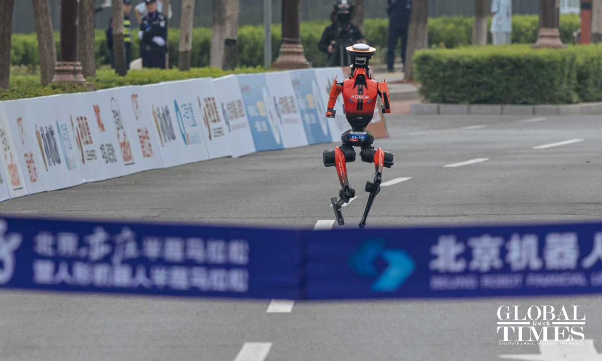 The second humanoid robot half marathon took place in Beijing E-Town on April 19, 2026. Over 100 robot teams participated, including five international teams. A remotely controlled "Lightning" robot from the Honor team was the first to cross the finish line, clocking 48 minutes and 19 seconds — beating the previous record of about 2 hours and 40 minutes, set by last year's champion, Tiangong Ultra, by nearly two hours. An autonomous-navigation "Lightning" robot from another Honor team won the title with a net time of 50 minutes and 26 seconds. Photos: Li Hao/GT
