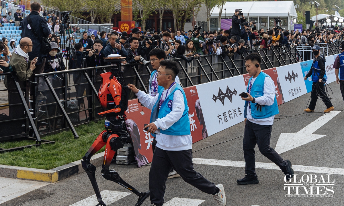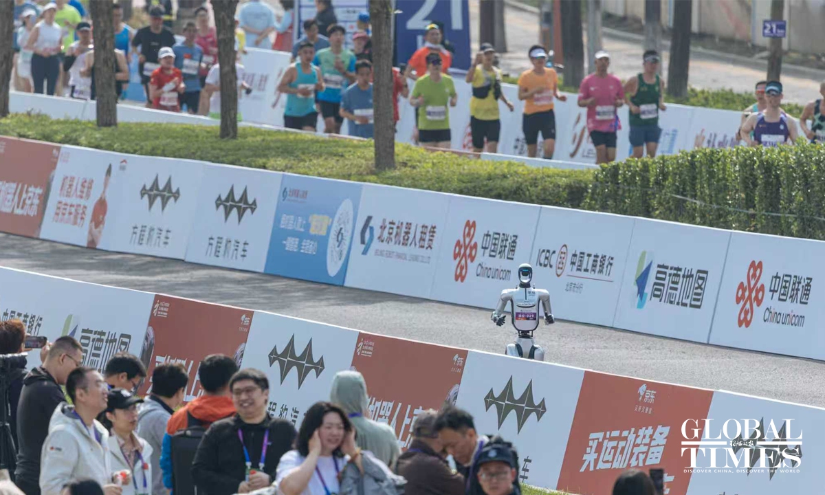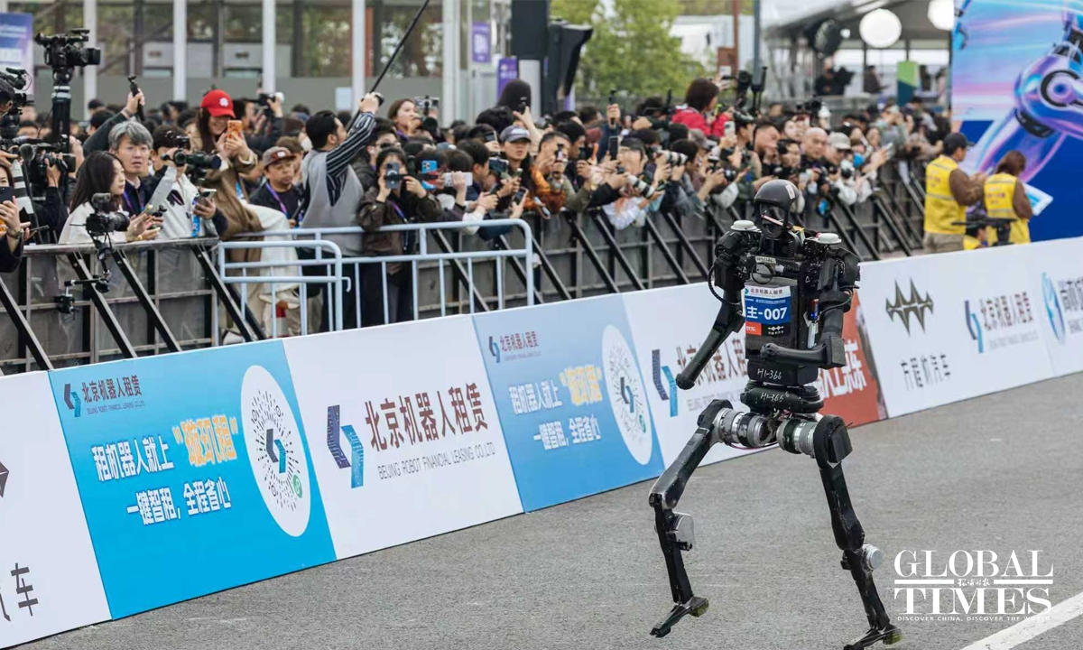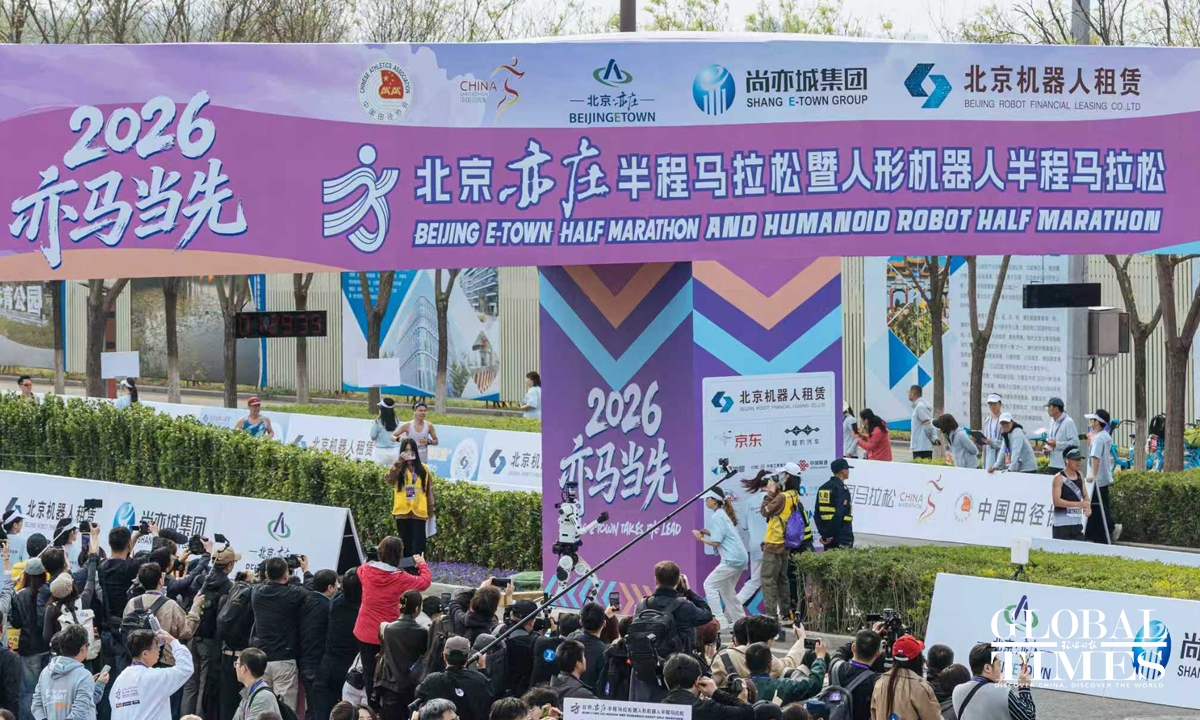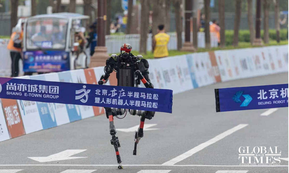 The second humanoid robot half marathon took place in Beijing E-Town on April 19, 2026. Over 100 robot teams participated, including five international teams. A remotely controlled "Lightning" robot from the Honor team was the first to cross the finish line, clocking 48 minutes and 19 seconds — beating the previous record of about 2 hours and 40 minutes, set by last year's champion, Tiangong Ultra, by nearly two hours. An autonomous-navigation "Lightning" robot from another Honor team won the title with a net time of 50 minutes and 26 seconds. Photos: Li Hao/GT
