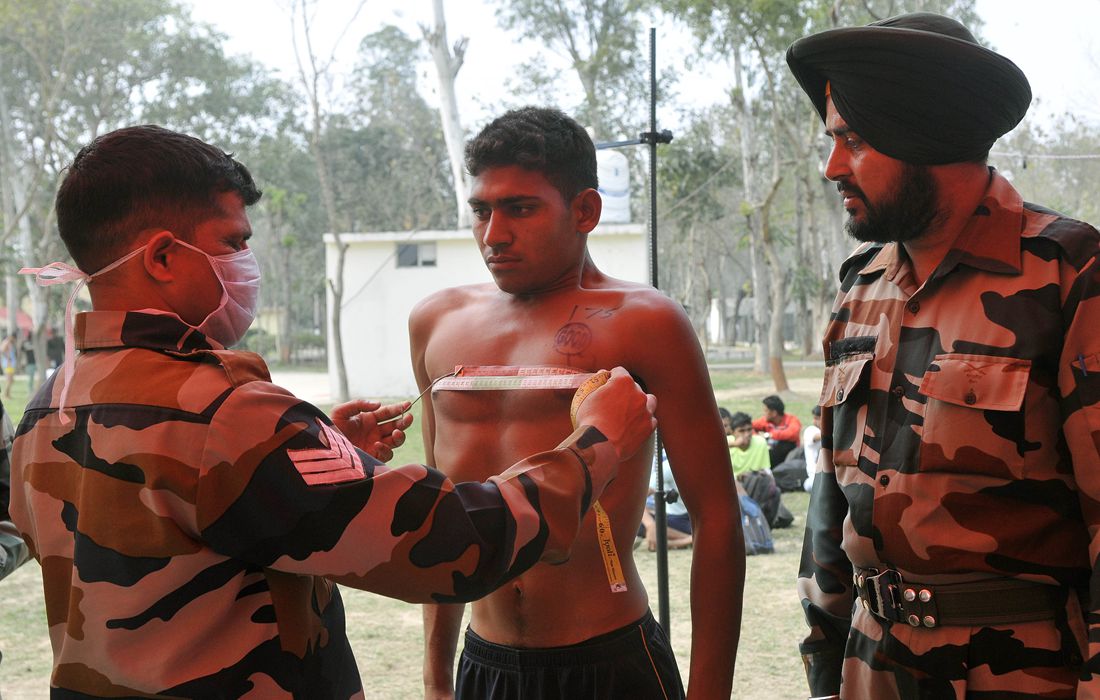 A trainer applies a rubber stamp to a young candidate’s chest at the Army Recruitment Rally held by the 152nd Infantry Battalion of the Indian Territorial Army in Ludhiana, India on February 23, 2017. Photo: Gurminder Singh/Hindustan Times /Getty Images/ CFP figcaption >