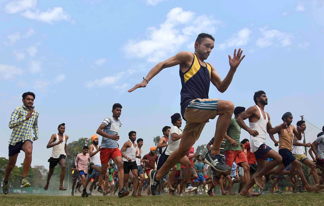 Young candidates race in a playground as they take part in the Army Recruitment Rally held by the 152nd Infantry Battalion of the Indian Territorial Army in Ludhiana, India on February 23, 2017. Photo: Gurminder Singh/Hindustan Times /Getty Images/ CFP figcaption >
