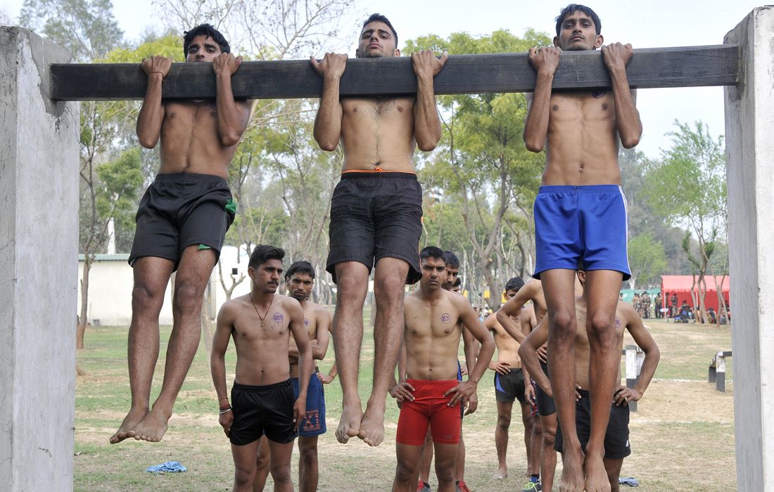 Young candidates perform pull-ups as they take part in the Army Recruitment Rally held by the 152nd Infantry Battalion of the Indian Territorial Army in Ludhiana, India on February 23, 2017. Photo: Gurminder Singh/Hindustan Times /Getty Images/ CFP figcaption >