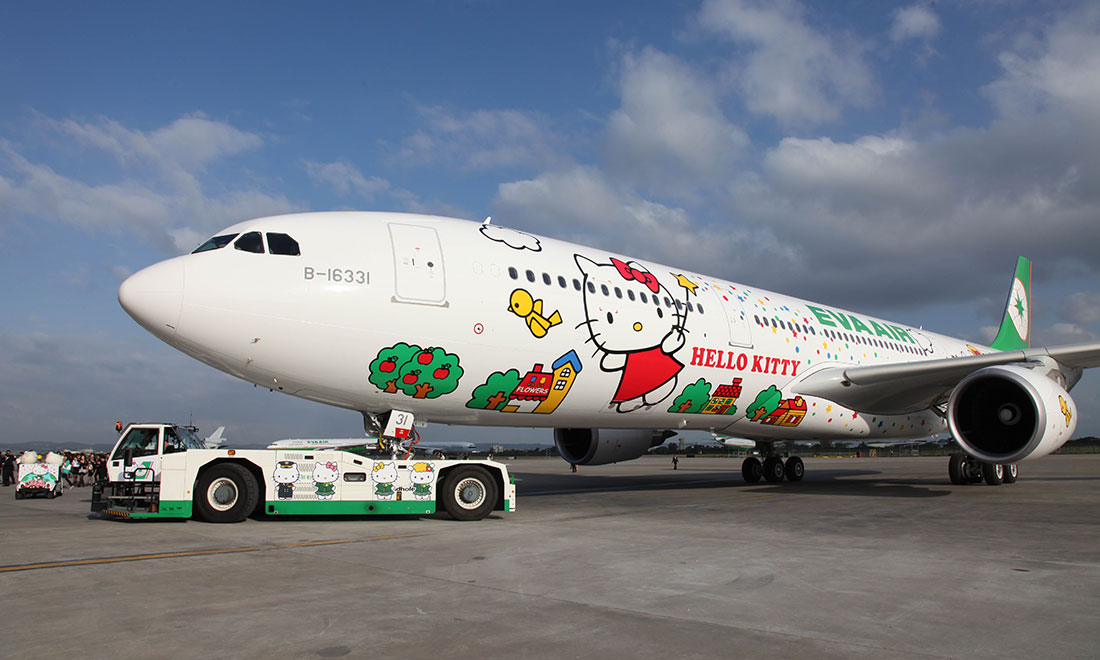 She gets around: Another EVA Air’s Hello Kitty Around the World is an Airbus A330-300, showing the cartoon visiting famous landmarks. Photo: travel.sina.com figcaption >