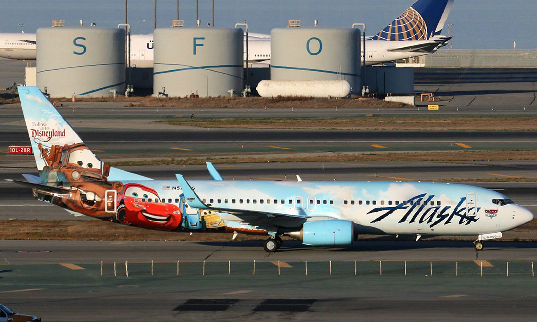Cars on a plane: US-based Alaska Airlines’ Boeing 737-800 with a livery of characters from Pixar cartoon Cars . Photo: travel.sina.com figcaption >