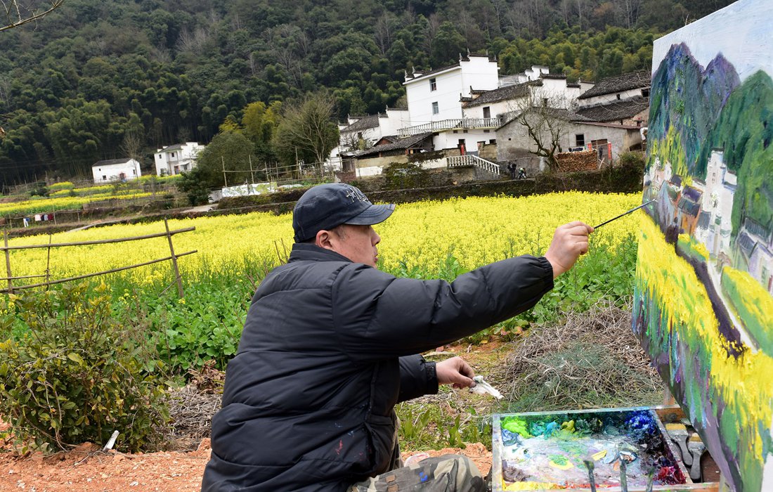 An artist paints rapeseed flower fields in Longwan village, Wuyuan county, China’s Jiangxi Province on March 5, 2017. Photo: CFP figcaption >
