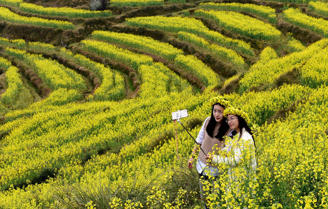 Tourists pose for selfies among rapeseed flowers in Longwan village, Wuyuan county, China’s Jiangxi Province on March 5, 2017. Photo: CFP figcaption >