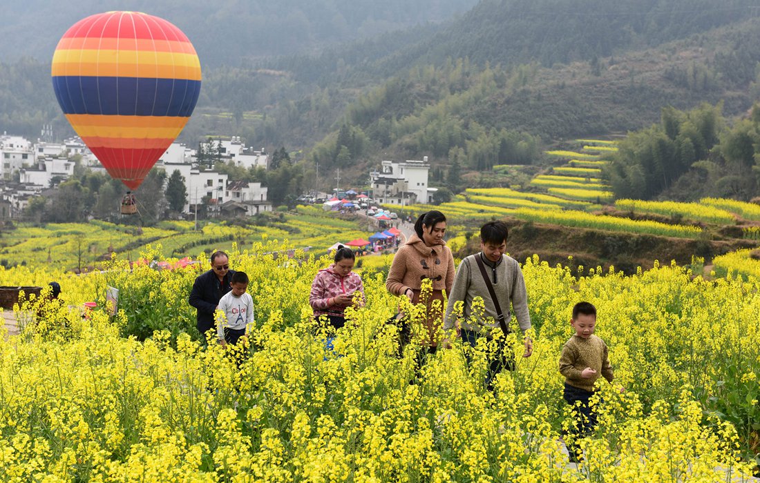 Tourists walk through rapeseed flower fields in Longwan village, Wuyuan county, China’s Jiangxi Province on March 5, 2017. Photo: CFP