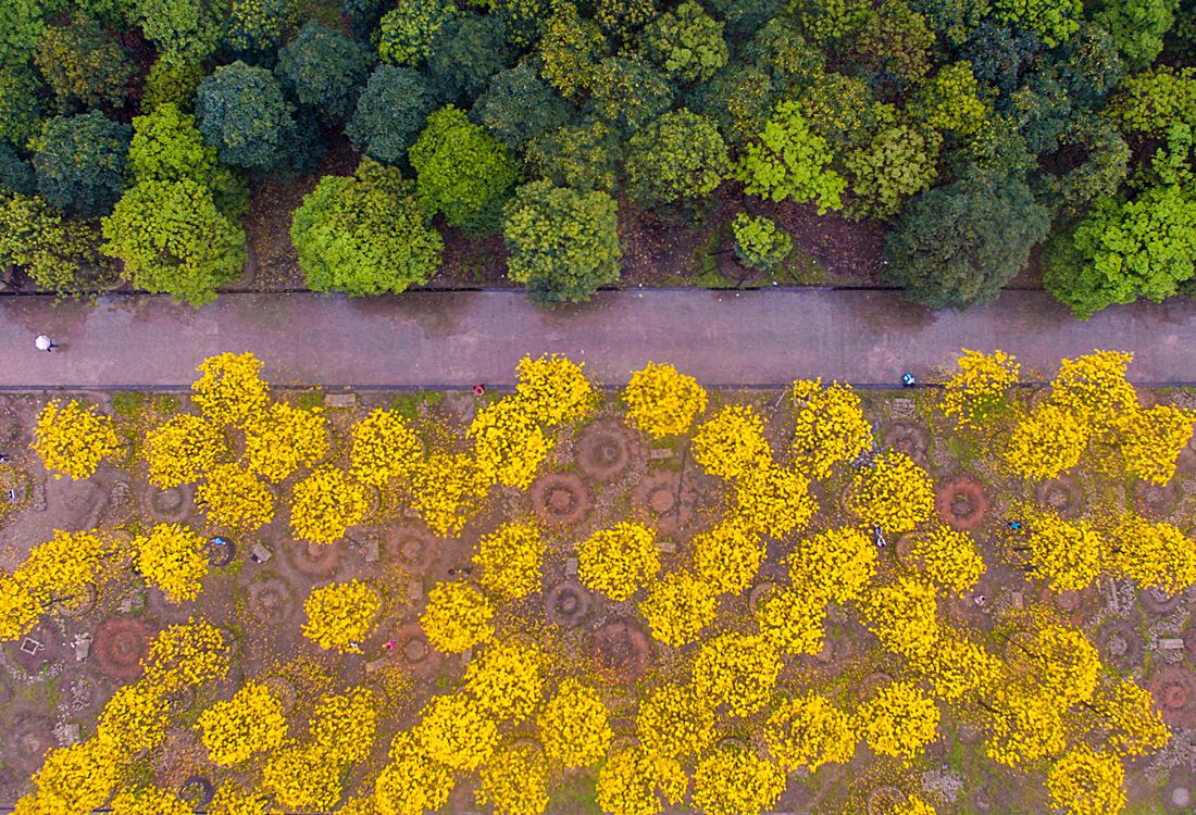 An aerial photo of blooming golden campanula flowers in the town of Beijiao, Foshan, China’s Guangdong Province on March 11, 2017. Photo: CFP figcaption >