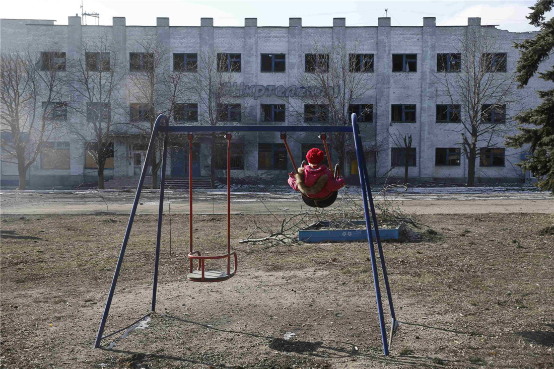 A girl plays on a swing in front of a building damaged by fighting in the city of Debaltseve, Ukraine on February 20, 2015. Photo: CFP
