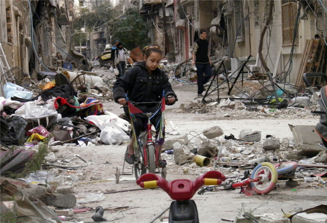 A girl rides a bicycle amid damaged buildings and vehicles along a street in the besieged area of Homs, Syria on November 11, 2013. Photo: CFP figcaption >