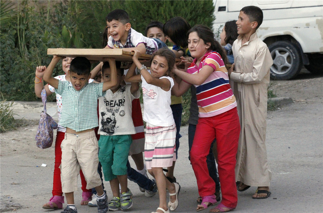 Children pretend to be carrying a coffin, as they play along a street in Raqqa province, eastern Syria on August 12, 2013. Photo: CFP figcaption >