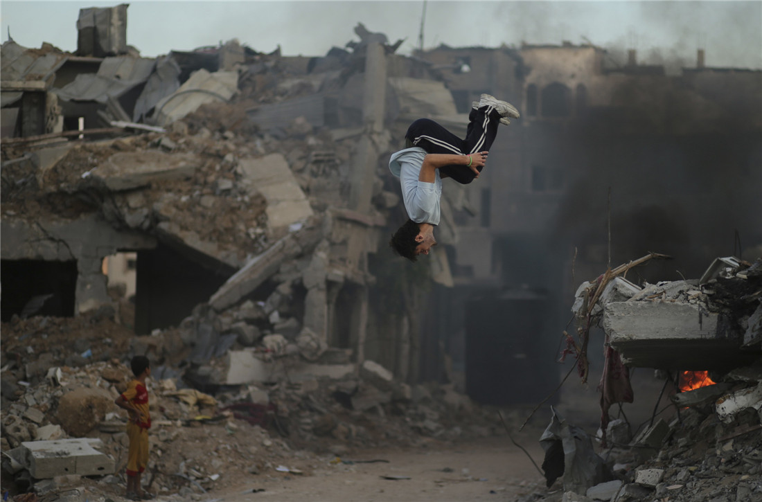 A Palestinian youth practices his Parkour skills over the ruins of houses, which witnesses said were destroyed during a seven-week Israeli offensive, in the Shejaia neighborhood east of Gaza on October 1, 2014. Some Palestinian youths aged between 13 and 17 years old train in the devastated area as a personal initiative to develop their skills. Parkour is a physical discipline of movement focused on overcoming obstacles. Photo: CFP