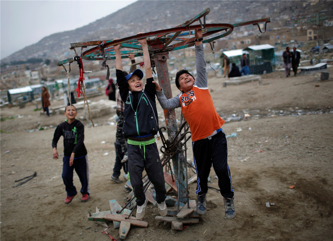 Afghan boys play with a broken swing in Kabul on April 3, 2014. Photo: CFP