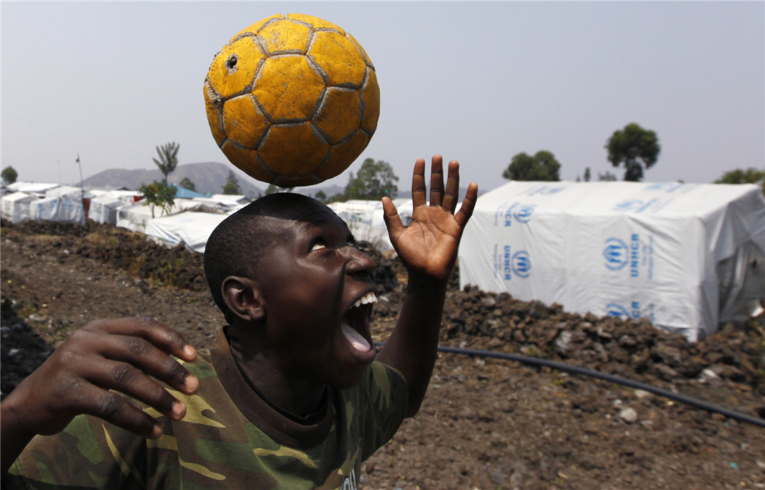 A Congolese boy displaced by fighting in North Kivu, juggles a ball near his makeshift shelter at the Mugunga III camp for internally displaced people near Goma, eastern Democratic Republic of Congo on August 4, 2013. Photo: CFP figcaption >
