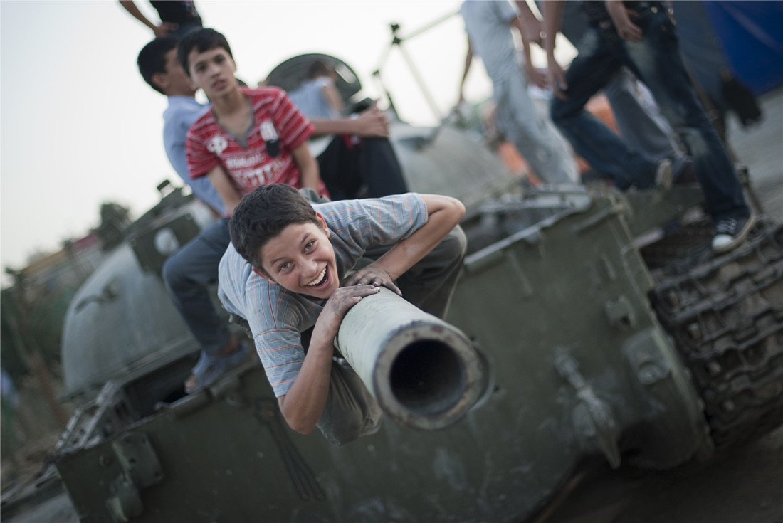 A boy smiles as he plays on a tank at a war exhibition held by Iran's revolutionary guard to mark the anniversary of the Iran-Iraq war (1980-88) in southern Tehran on September 26, 2011. Photo: CFP figcaption >