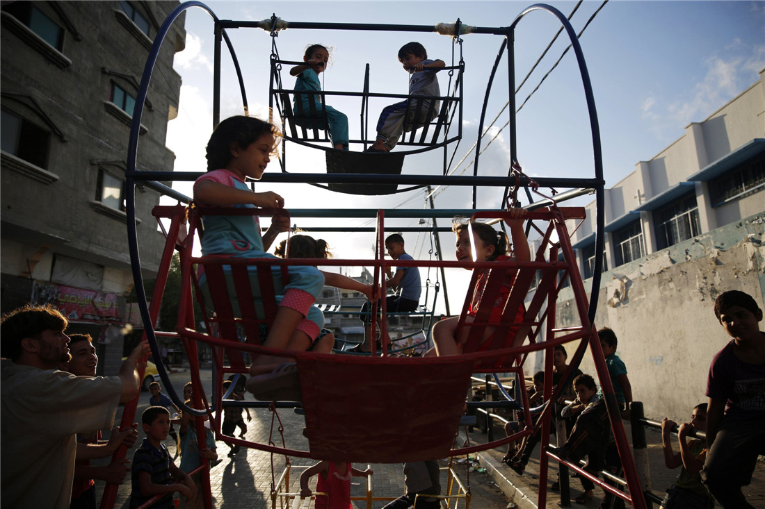 Palestinian children play on a mini Ferris wheel along a street in Beit Lahiya in the northern Gaza Strip on July 29, 2014. Israel knocked out Gaza's only power plant, flattened the home of its Islamist Hamas political leader and pounded dozens of other high-profile targets in the enclave on July 29, 2014, with no end in sight to more than three weeks of conflict. More than 1,100 Gazans, most of them civilians, have been killed in the conflict. On the Israeli side, 53 soldiers have been killed as well as three civilians. Photo: CFP