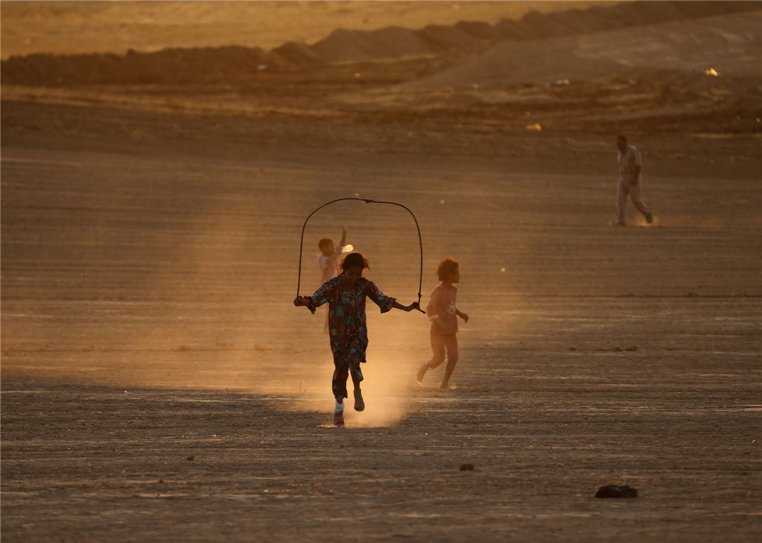 Children, who fled from the violence in Mosul, play during sunset inside the Khazer refugee camp on the outskirts of Arbil, in Iraq's Kurdistan region, on June 27, 2014. Photo: CFP figcaption >