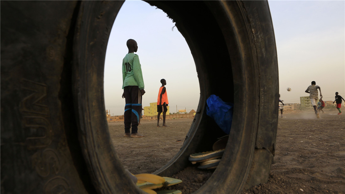 Boys are pictured through a tyre as they play soccer at a railway station camp, where refugees from South Sudan have stayed for four years, in Khartoum on May 11, 2014. Photo: CFP figcaption >