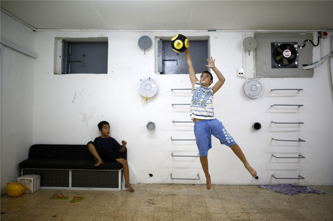 An Israeli boy plays with a ball in a public bomb shelter in the southern city of Ashkelon, Israel on August 4, 2014. In Israeli southern communities hit by daily rocket and mortar bomb attacks from the Gaza Strip, some residents remained in their shelters. Photo: CFP