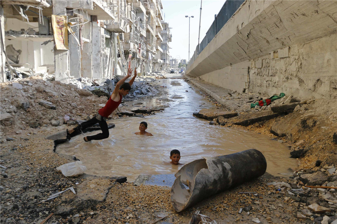 A boy dives into a crater filled with water in Aleppo's al-Shaar district, Syria on July 10, 2014. Activists said the crater was caused by barrel bombs dropped by forces of Syria's President Bashar al-Assad. Photo: CFP