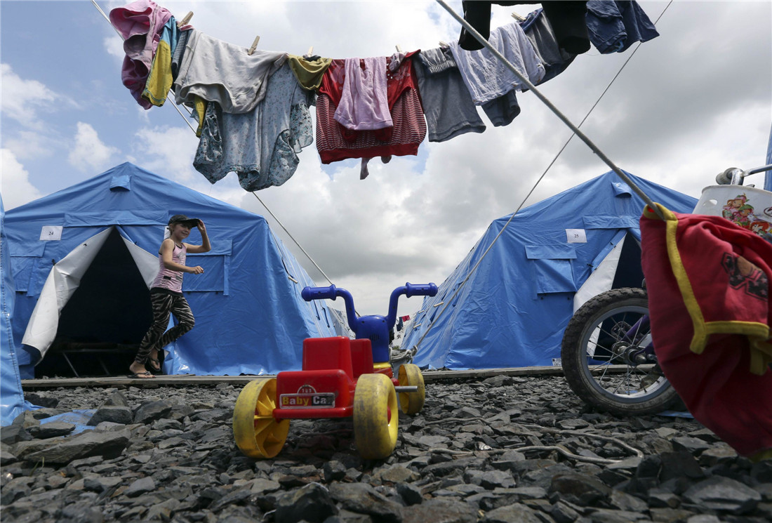 A girl runs at a temporary tent camp set up for Ukrainian refugees in the town of Novoshakhtinsk in the Rostov region near the Russian-Ukrainian border, southern Russia on July 9, 2014. Photo: CFP figcaption >