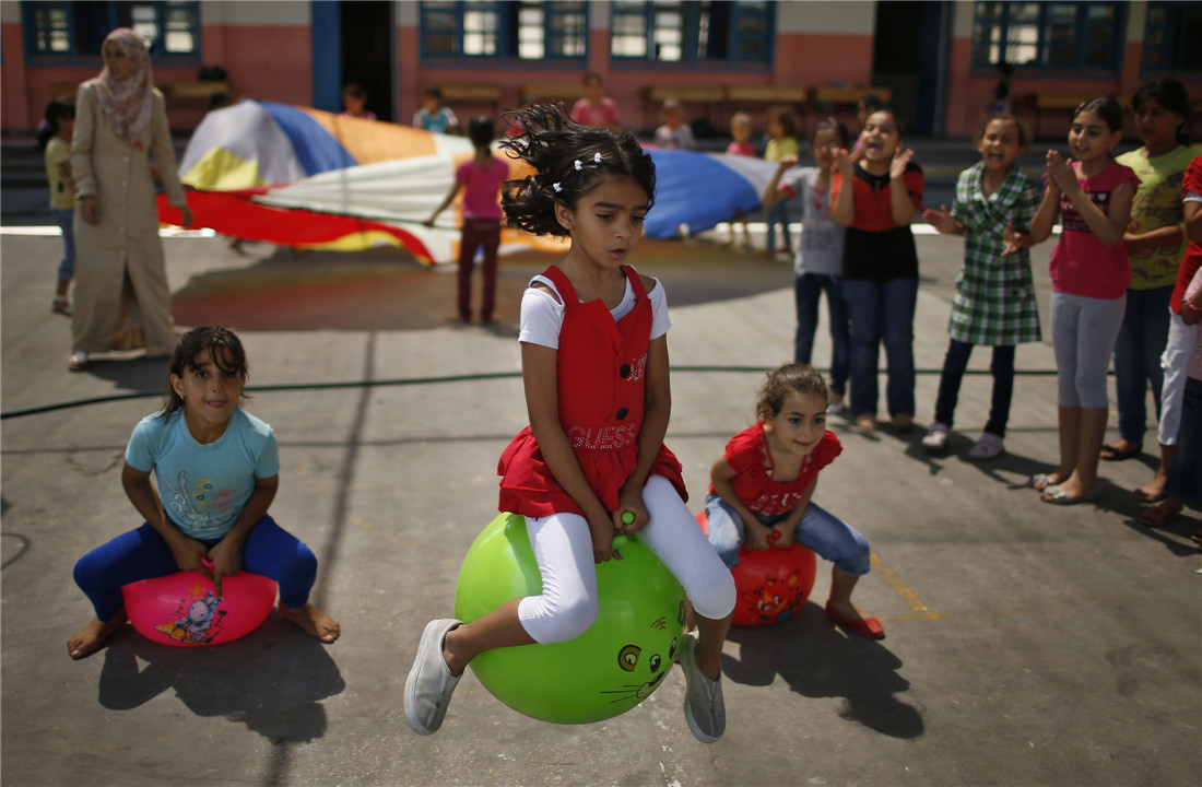 Palestinian girls play during UN-run summer fun games week in Gaza on June 17, 2013. Tens of thousands of children from the Gaza Strip spend at least part of their holidays in special summer camps, arranged around a wide array of activities. Photo: CFP figcaption >